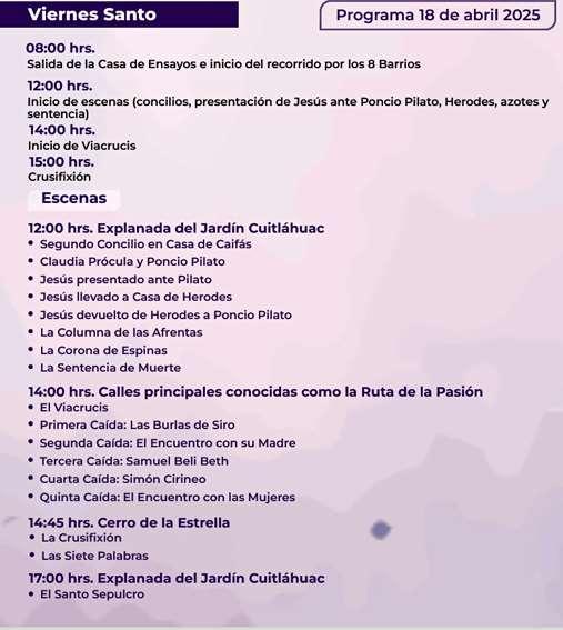 "Se contemplan cierres de vialidades desde las 12 horasdeljueves ala una de la mañana del sábado. El recorrido abarcará las calles de Aztecas, 5 de Mayo, avenida Toltecas, Callejón General Anaya, calle General Anaya, Ignacio Comonfort, calzada Ermita Iztapalapa, Ayuntamiento, avenida Luis Hidalgo Monroy, calle Concepción Álvarez,Vicente Guerrero,Artemio Alpízar Ruz, Allende, Ayuntamiento, Corredor Hidalgo, Lerdo de Tejada,Cuauhtémoc,Estrella y Camino al Cerro de la Estrella".