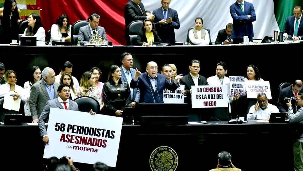 Durante el debate en San Lázaro, los diputados del PRI llevaron un ataúd simbólico para denunciarla"muertedela libertadde expresión", mientras otros aludieron a 1984, la novela distópica de George Orwell,en la que un Estado totalitario vigila permanentemente a sus ciudadanos.