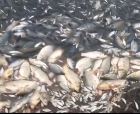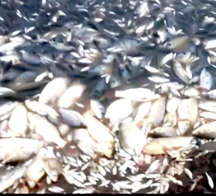 Enelvideograbadoporlos vecinos,sevequemilesde pecesmueren,debidoaque lalagunaestácasiseca.