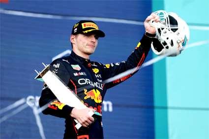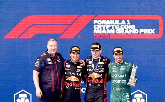 El neerlandés Max Verstappen (Red Bull) reforzó su liderato en el Mundial de Fórmula Uno al ganar ayer domingo el Gran Premio de Miami (EE. UU.), el quinto del año,disputado en el circuito construido en torno al Hard Rock Stadion de la citada localidad del estado de Florida; donde relegó al segundo y al tercer puesto -respectivamente- a su compañero, el mexicano Sergio Pérez, y al español Fernando Alonso (Aston Martin), que logró su cuarto podio de la temporada:el 102 en la categoría reina.