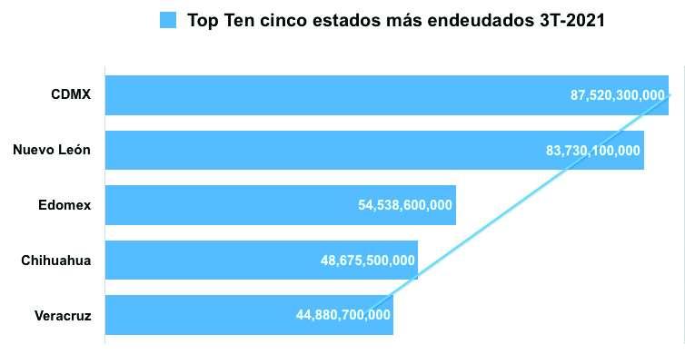 Mientras que al cuarto trimestre de 2022 (último disponible), el Gobierno del Estado de México concentró una deuda pública de 64 mil 455 millones de pesos,colocándose en un nada honroso tercer lugar a nivel nacional, sólo por debajo de la Ciudad de México y Nuevo León, de acuerdo a información del Centro Nacional de las Finanzas Públicas (CEFP) de la Cámara de Diputados de la LXV Dicho monto de la duda representa el 67% de los ingresos generados por el Estado previstos para el ejercicio fiscal 2023,precisó.