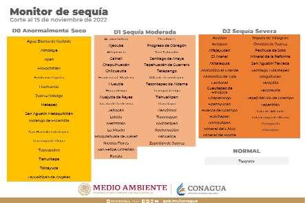 De acuerdo con el Monitor de Sequía en México, a través de la Dirección Local Hidalgo de la Comisión Nacional del Agua (Conagua), se informa que 31 municipiosreportan sequía severa, 36 sequía moderada, 16 condiciones anormalmente secas y una demarcación se encuentran en condiciones normales,como se enlista a continuación: Enel primercasoseencuentranAcatlán, Actopan, Alfajayucan, El Arenal, Atitalaquia,Atotonilco el Grande,Atotonilco de Tula, Cardonal, Cuautepec de Hinojosa, Chapantongo, Epazoyucan, Huasca de Ocampo,Huichapan,IxmiquilpanyMineral delChico.