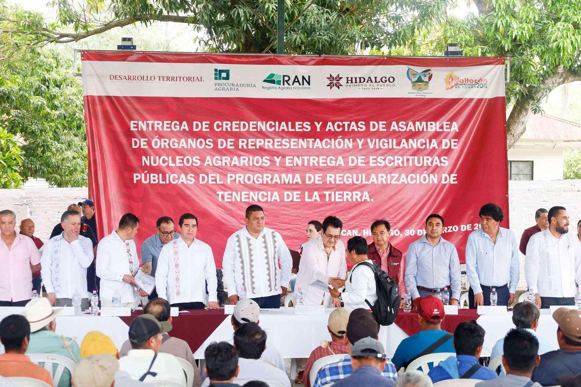 Como parte del impulso de una nueva política agraria promovida porelgobernadorJulioMenchaca Salazar, en gira de trabajo por la comunidad de Huichapa,municipio de Jaltocán,y con la finalidad de elevar la calidad de vida de los ejidatarios de esta región, en un evento sin precedentes se entregaron 23 credenciales e igual número de actas de asamblea de órganos de representación y vigilancia,a los núcleos agrarios de seis municipios huastecos.