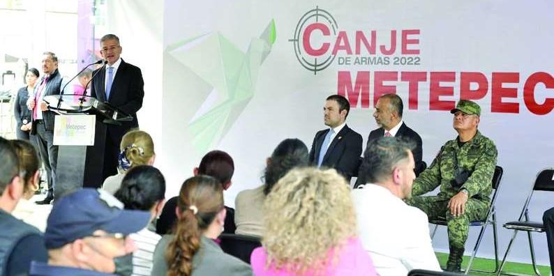 Desde su puesta en marcha,a partir del 22 de agosto y hasta el corte del 15 de octubre del año en curso, el Programa Canje de Armas 2022 ha logrado recolectar 767 armas de fuego de diferentes cali bres,225 explosivos,160 activosy 65 inertes,ademásde casi 22 mil municiones,con un intercambio de dos millones 784 mil 593 pesos en efectivo.