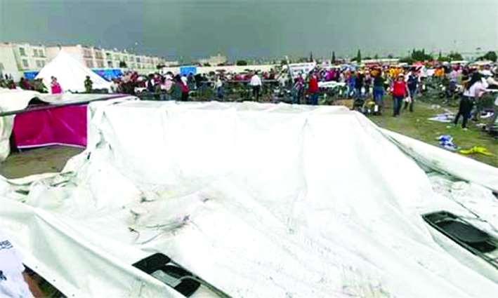 Durante el evento convocado a las 16:30 horas de ayer en Tecámac, los fuertes vientos ocasionaron que el desplome del templete y lonas cayeron encima de decenas de personas, quienes atemorizadas trataron de salir agachadas, sin embargo, unos 30 resultaronafectados,unos 16 con golpes de consideración.