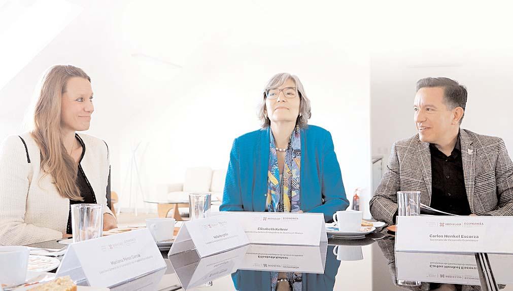 Eltitular de la Secretaría de Desarrollo Económico (Sedeco) de Hidalgo,Carlos Henkel Escorza,recibió la visita de la embajadora de Austria en México,Elisabeth Kehrer,y de Nella Hengstler,consejera comercial de la nación europea, en el Parque Industrial Platah, En ese encuentro, además de estrechar relaciones bilaterales entre Hidalgo y Austria,permitió detallar las múltiples áreas de oportunidad,las ventajas y el posicionamiento que ofrece el estado a los inversionistas.