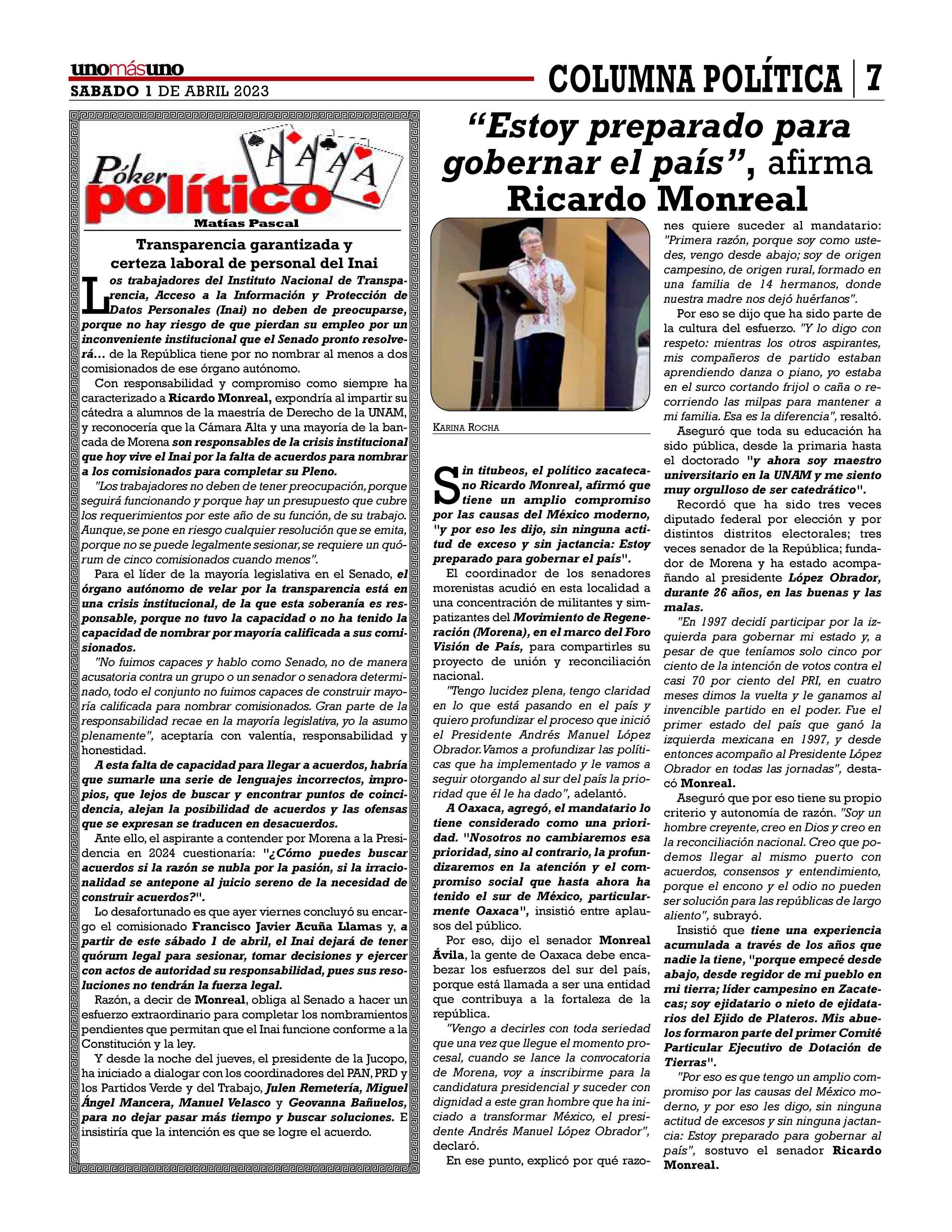 Más datos: Se conoció con el coordinador de los diputados de Morena en la Cámara Baja, Ignacio Mier, quien comentó que la insaculación avalada con las diferentes coordinaciones parlamentarias para decidir la selección de los cuatro consejeros electorales, quienes protestarán ante el Consejo General del INE el próximo lunes 3 de abril, fue posible debido a arduas negociaciones. Recordó que el plazo límite para llegar a un acuerdo fue en la madrugada del viernes 31 de marzo a las 2:35 horas que recayó en favor de la nueva presidenta consejera Guadalupe Taddei Zavala y sus similares JorgeMontañoVentura y Arturo Castillo Losapara quieneses necesario replantear los programas de educación cívica desde la educación media superior. Aseguró que las dos designaciones mujeres y dos hombres como los nuevos consejerosdelINE,respondenafuncionarioshonestosypreparados.