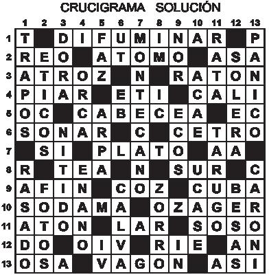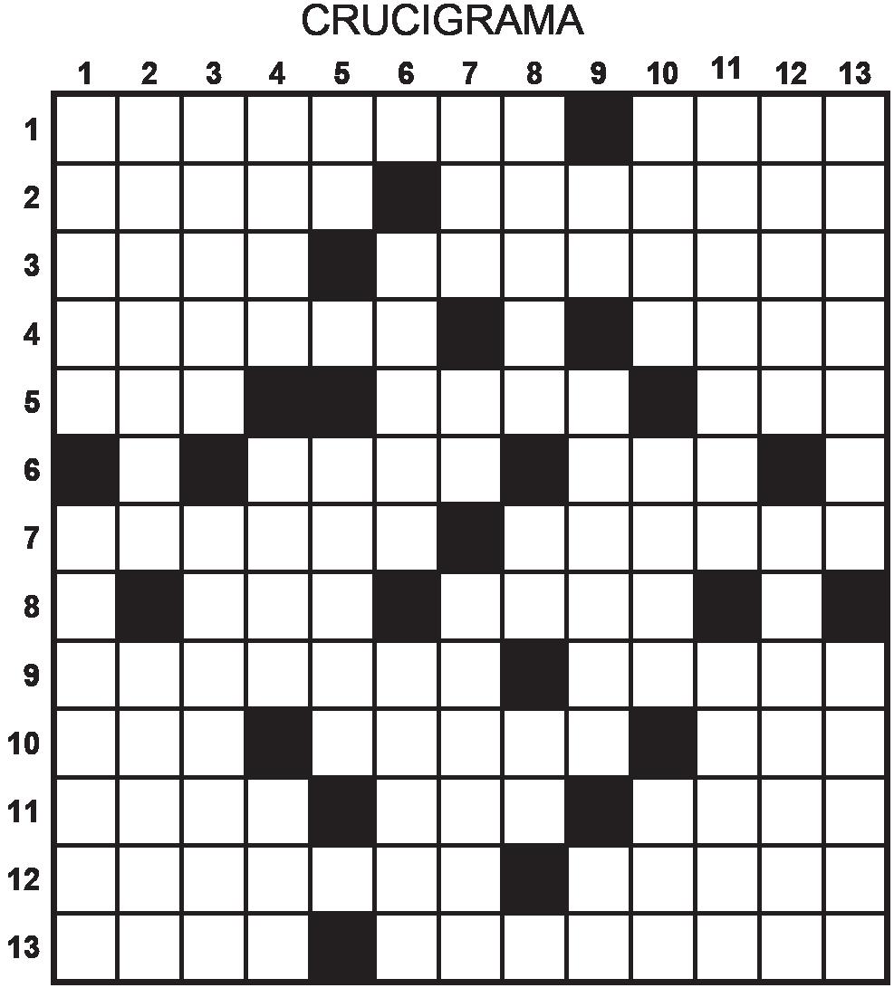1.- Relativa a la sabana. –(Inv.) Dícese del cabello blanco. /2.- Embiste, acomete. – Recordaba, traía a la memoria. /3.- Ido, pasmado, perplejo. – Comenzabas a mostrar, dabas indicios. /4.- Cadena montañosa de Rusia, límite natural entre Europa y Asia. – Ciudad de Italia. /5.- Prefijo que indica, negación, separación dificultad o distinción. – Prefijo que indica afuera - Aire musical originario de Cuba. /6.- Alero del tejado. – Haga loas, alabes. /7.- Esparcir en gotas menudas un líquido. - Adj. Que es de movimiento lento, tardo y pesado, falto de habilidad y destreza (Pl.) /8.- Reconocida agencia publicitaria de Venezuela. – Sacerdote católico. /9.- Elemento de número atómico 15 y símbolo P. – (Inv.) Carlos _____ reconocido atleta de la apnea y el buceo libre venezolano. /10. Universidad Nacional Abierta (siglas) – Palas de madera para impulsar la nave. – Envejece, desmerita, arruga algo con las manos. /11.- (Ven) Balde, canarín. – Período de 24 horas. – Con forma de huevo. /12.- (Inv.) Calidad de torpe, acción desatinada. – Aliado, juntado, combinado. /13.- Nombre de una flor muy preciada. – El que tiene por oficio la pesca.