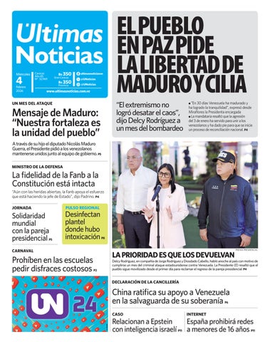 el pueblo en paz pide la libertad de maduro y cilia ”En 30 días Venezuela ha madurado y “El extremismo no ha logrado la tranquilidad”, expresó desde la Presidenta encargada logró desatar el caos”, Miraflores La mandataria resaltó que la agresión 3 de enero ha servido para unir a los dijo Delcy Rodríguez a del venezolanos y ha dado pie para que se inicie un mes del bombardeo un proceso de reconciliación nacional. P4 l