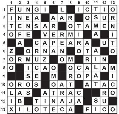 – Hedor, pestilencia, hediondez. / 3.- Imperdonable, grave, gruesa, grasa. – Sonido reflejado. /4.- Soborno, mordida, bajada de la mula. – Abreviatura de zoológico. – Símbolo de la plata. /5.- Perro. – Relació escrita de lo acontecido y acordado en una reunión o asamblea. – (Inv.) Utilizas, empleas. /6.- Antes Meridiem (Siglas). – Niña. – (Inv.) Siglas de Escuela Técnica Industrial. / 7.- Ritual danzado en honor a San Antonio de Padua Típico del estado Lara. /8.- (Inv.) Abreviatura de doctor. –Demuestren alegría con la risa. – Ánade, ganso. /9.- (Inv.) Raspa desgasta con un instrumento cortante. – Amarran inmovilizan con cuerdas. – Oxido, herrumbe. / 10.- Necesidad, ganas de dormir. – Orquesta Sinfónica de Caracas (Siglas. - Categoría del beisbol. / 11.- Célebre fabulista griego. – (Inv.) Hermano de uno de los padres. / 12.- Ciudad y antigua capital de Nigeria. – Escusado, Retrete. / 13.- Perseguir sin dar tregua. – Baño de vapor de origen escandinavo (Pl.)