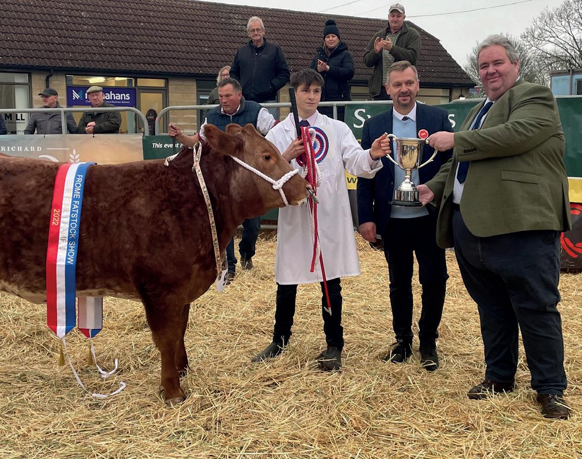 Young Farmer Percy Clatworthy took the Supreme Championship with his Limousin heifer selling at 415p/ kg to Wayne Pullen Butchers of Milborne Port.