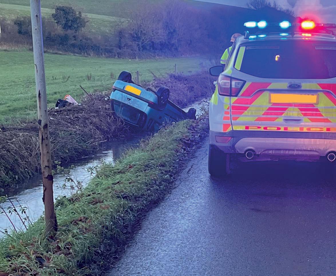 The vehicle, a small four-door hatchback, left the road some time around 3.15pm at Martinstown. Firefighters from Dorchester attended the incident.