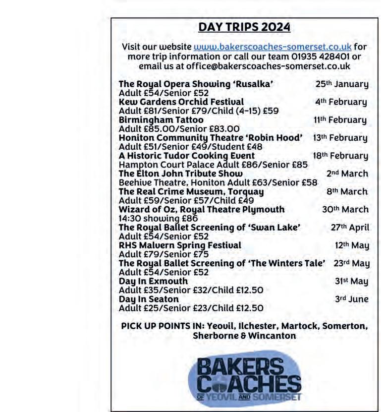Our coach starts at 5p.m. in Curry Rivel, then picks up in Langport & Somerton and either Keinton Mandeville & Shepton Mallet or Street & Wells. All profits are donated to British Red Cross The best way to keep up to date is at www.charitytheatretrips.com where there are full details and a booking form. Otherwise book by e-mail to charitytheatretrips@btinternet.com or phone Chris on 01458 273085.