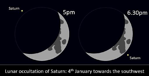 The planet Saturn is visible in our evening skies until mid-February. Lying in a relatively empty part of the sky, it is easy to spot within the constellation of Aquarius using the help of any free downloadable night sky app. On the evening of January 4th it is occulted by (passes behind) a crescent Moon, disappearing for about an hour and a half between 5pm and 6.30pm. Binoculars will help bring this event to life by enlarging Saturn and highlighting the lunar surface, but a telescope is required to see Saturn’s rings. The planet will disappear behind the upper-left dark portion of the Moon and reappear from the lower-right bright side.