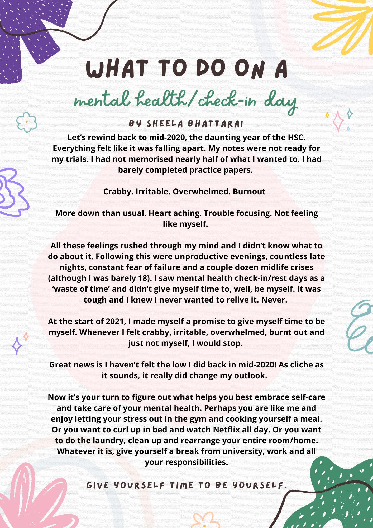 We highly encourage students to reflect on their mental wellbeing, considering small steps that you might take to care for your wellbeing.