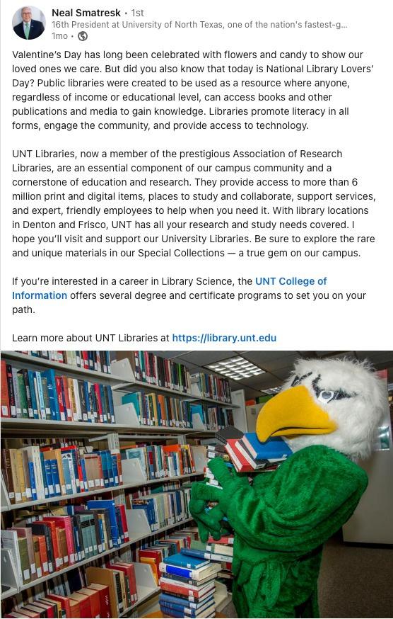 library on projects for her classes The librarians in her school encouraged her to consider moving into the library, which brought her to UNT’s Master of Library Science program with the school certification focus. After finishing her degree, her husband was transferred to the DFW area, and she decided to take time off to raise her kids. Then a position came open at the Justin Public Library, so she applied and started using her library degree for the first time since she graduated.