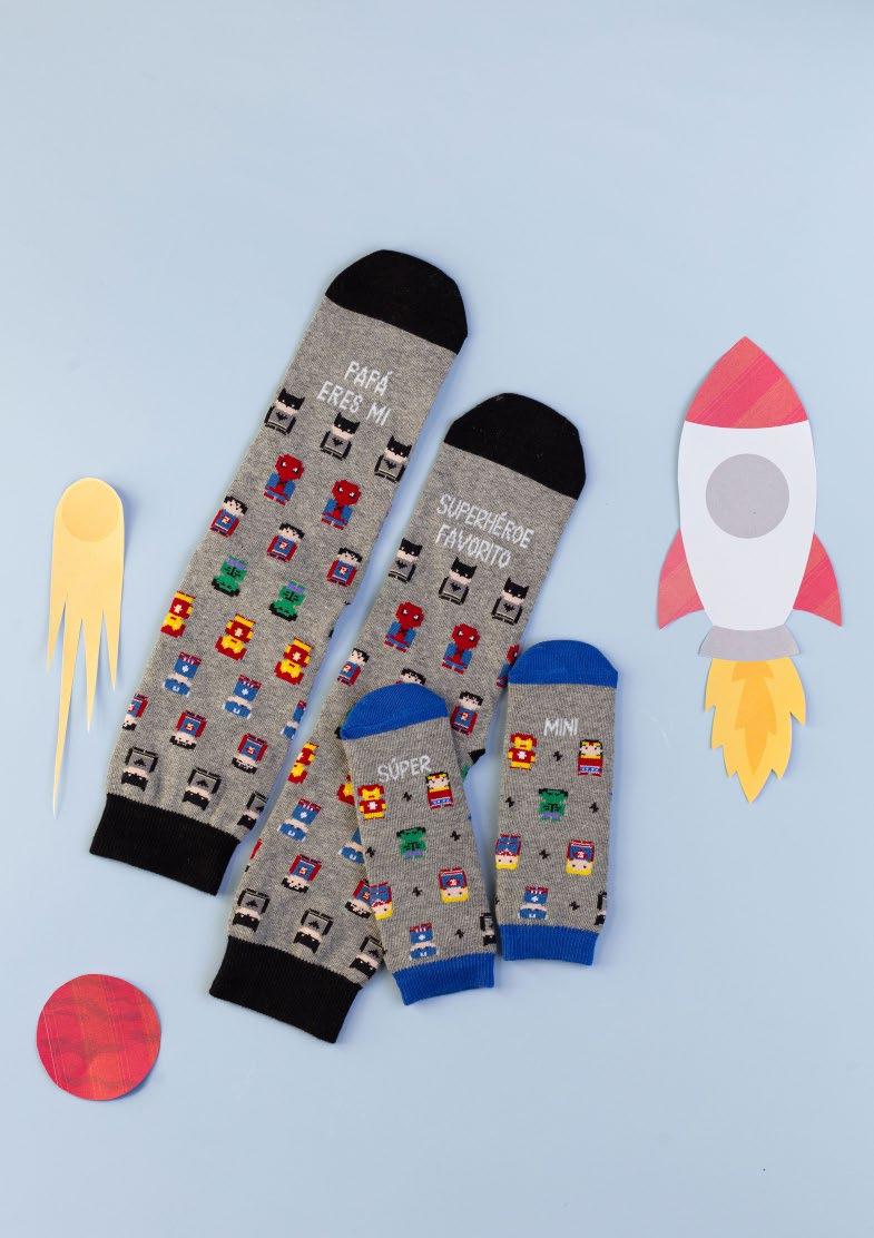 I ncluye: Calcetines “Papá eres mi superhéroe favorito”, Calcetines mini “Súper mini”
