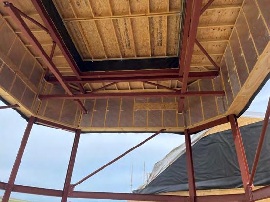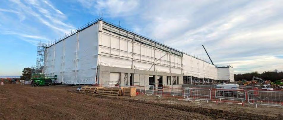 Each of the roof trusses comprises four of the 4.8 x 2.4m cassettes, which then form a monopitch structure with a 25-degree slope, supported by the exterior walls and intermediate steel stanchions. Then to withstand the high wind speeds common in Orkney, the build-up is being completed with the installation of zinc standing seam profiles.