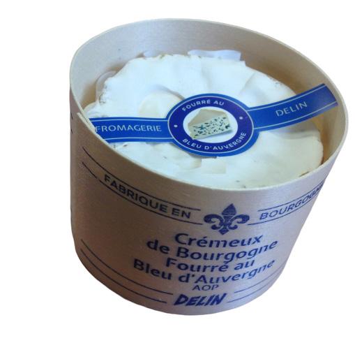 CREMEUX DE BOURGOGNE FOURRE AU BLEU D’AUVERGNE AOP 5X100 G Zachte dubbele roomkaas gevuld met Bleu d’Auvergne, met gebloemde korst.