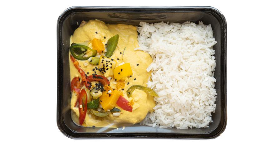 Gemarineerde kip met curry, groentjes en rijst Poulet mariné au sauce curry, légumes et riz