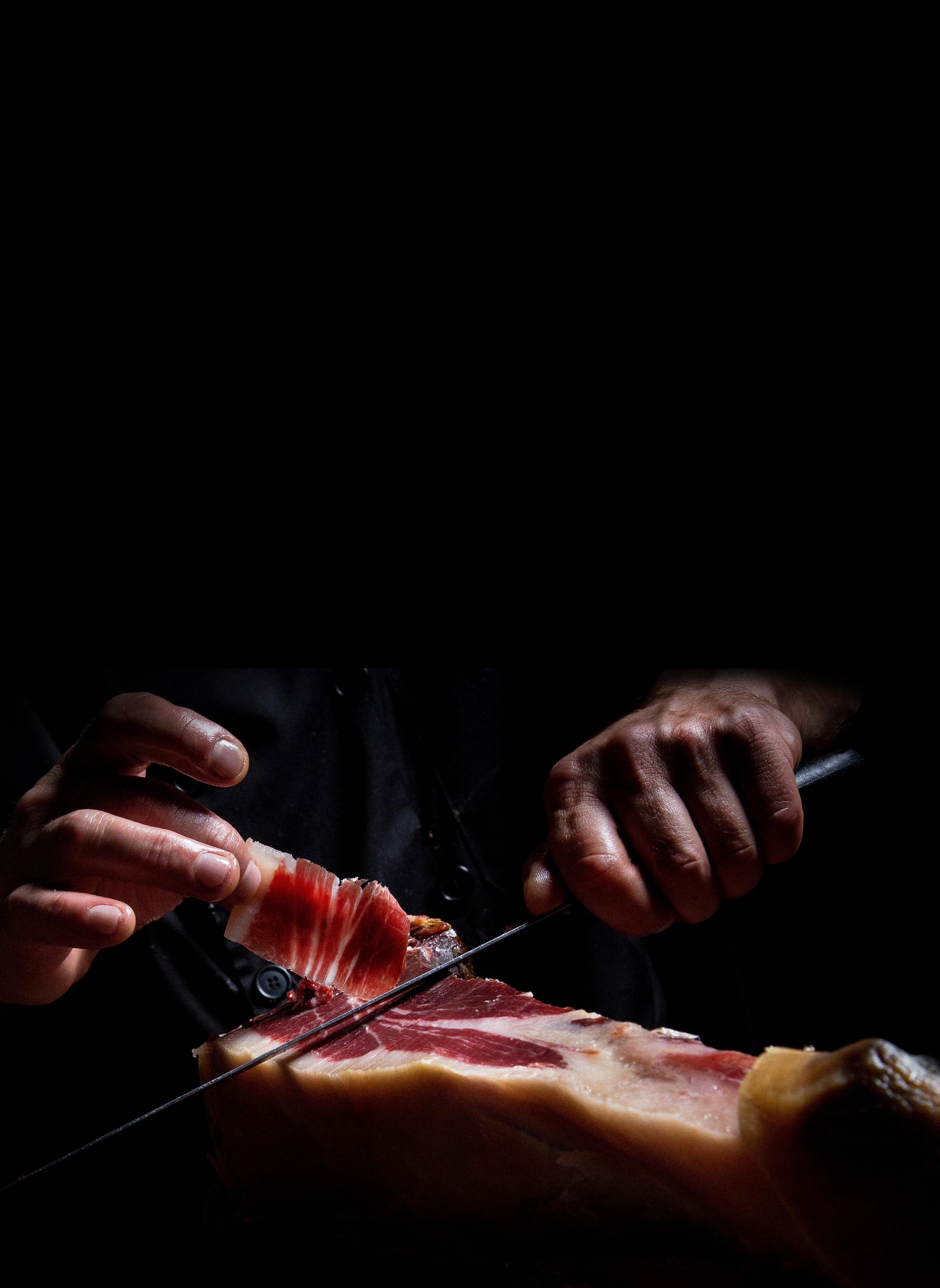 Le Jamón Ibérico de Bellota de Jabugo est un jambon à base de porcs ibériques nourris aux glands de chênes-lièges et plantes aromatiques dans un environnement de Dehesaespagnole.