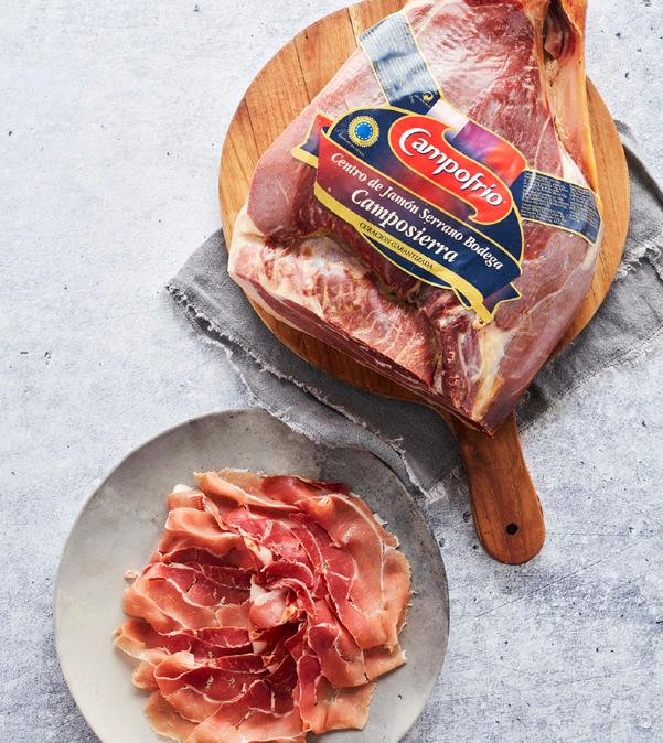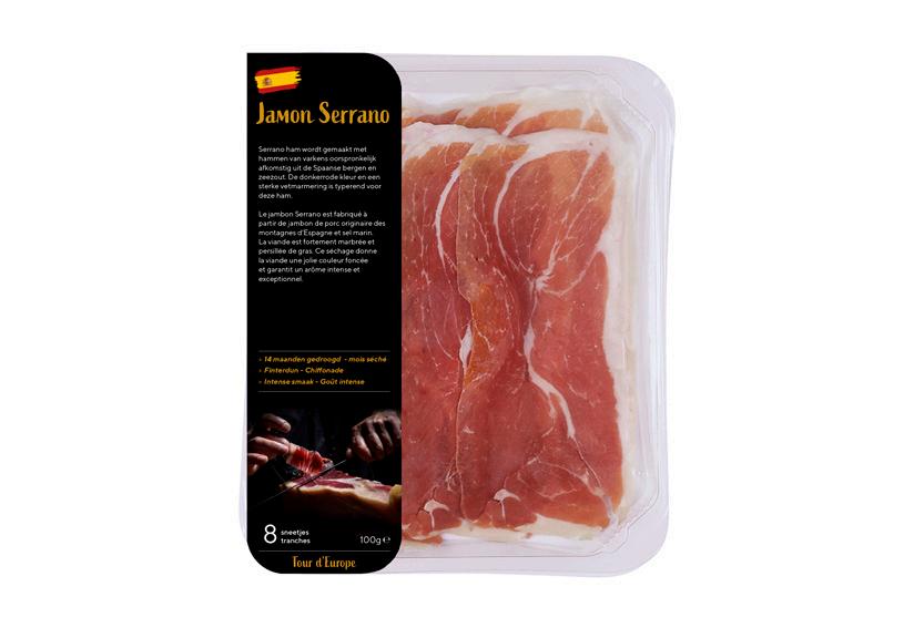 Le jambon Serrano est fabriqué à partir de jambon de porc originaire des montagnes d’Espagne et sel marin. La viande est fortement marbrée et persillée de gras. Ce séchage donne la viande une jolie couleur foncée et garantit un arôme intense.