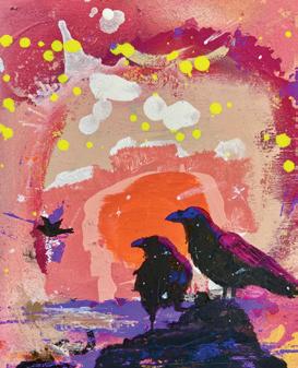 She continues, “I paint ravens somewhat realistically, but I am aware of raven symbolism in many cultures. In particular, I’m fascinated with Alaskan First Nations and Norse mythologies. In my ‘Intergalactic Ravens’ series, the birds fly into outer space, and some bring back messages for humans, like Odin’s ravens, Hugin and Munin, in Norse legends.”