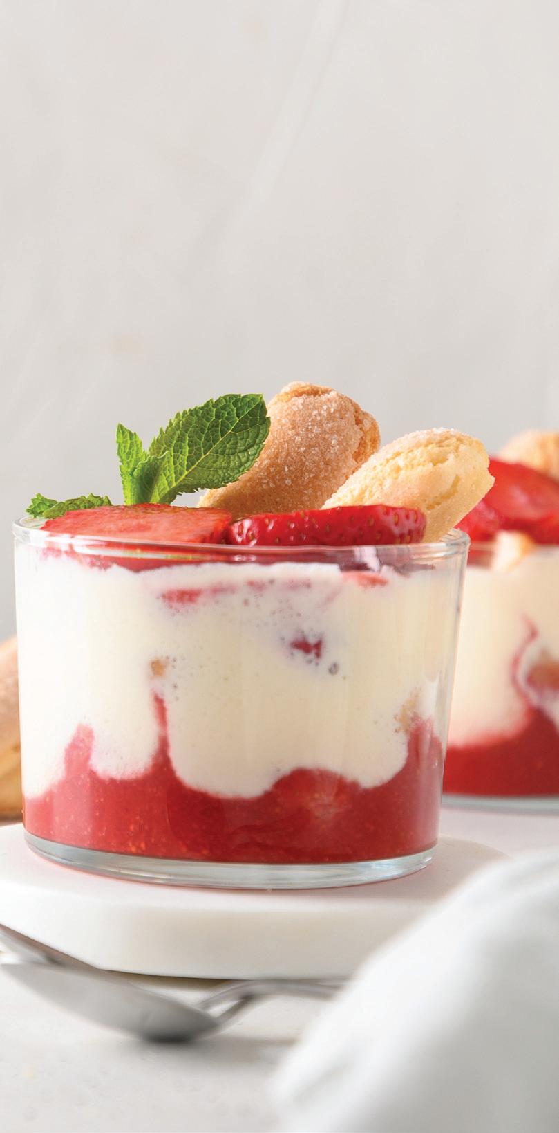 layer of soaked or dry savoiardi (you can brush with orange juice or syrup if preferred). Add a layer of the macerated strawberries with some juices. Spoon over a layer of the mascarpone cream. Repeat layers until the dish is filled, ending with a layer of mascarpone cream.