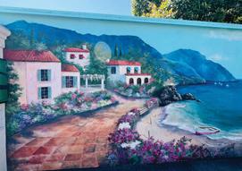 Kamile was still worried that established muralists might not accept her, a newcomer with an unusual painting style. But when Christine MacShane heard that a new mural painter had arrived, she responded, “How exciting! Climbing scaffolds is getting iffy for me, and I’m cutting back on murals in favor of teaching. Kamile is welcome to the surplus paints I have stored in my garage." Chris Conway, General Manager of In Motion Fitness, speaking of the Mediterranean mural project, said, “We have had graffiti artists at work mixed in with traditional artists…and they’ve all gotten along smashingly."