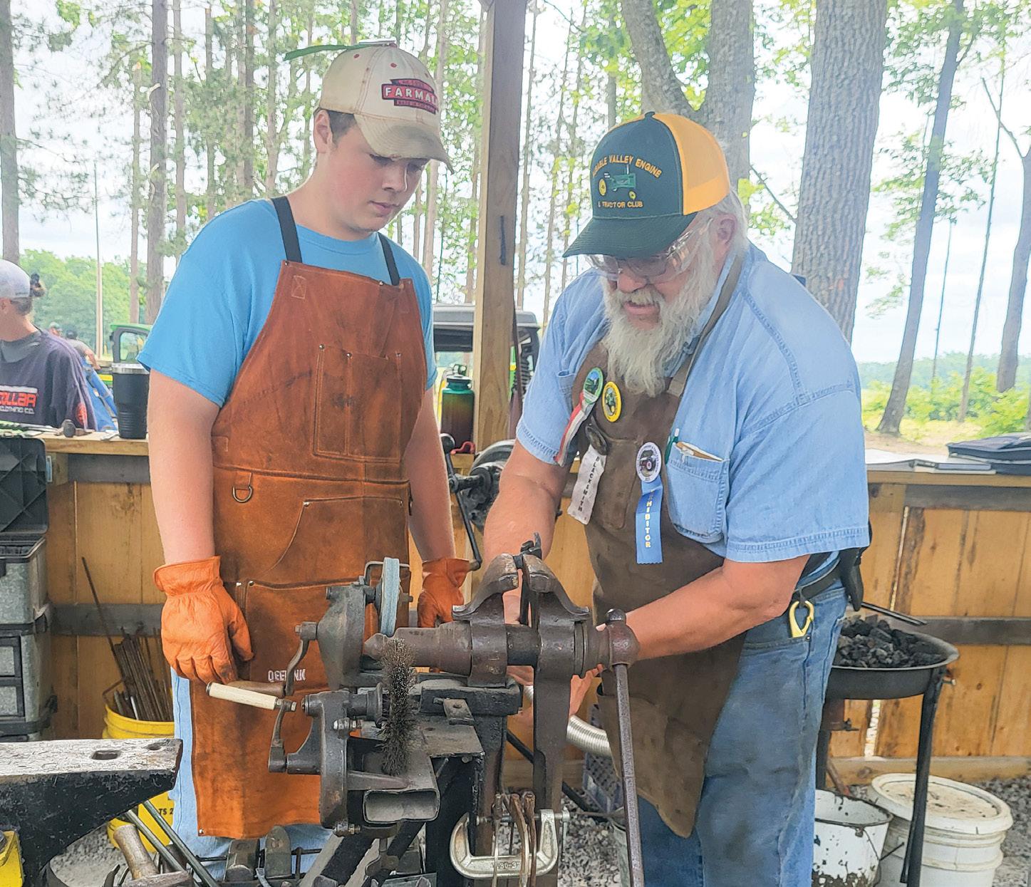 OLD TRACTORS AND YOUNG HANDS - The Oscoda County Fairgrounds was the site of the AuSable Valley Tractor Show. People brought tractors from across the state for the two-day event. Lane Hiser (13) of Fairview learning the trade of blacksmithing with Jack Benjamin as his instructor. See more photos on Page 8. ~ Photo by Sarah Novak