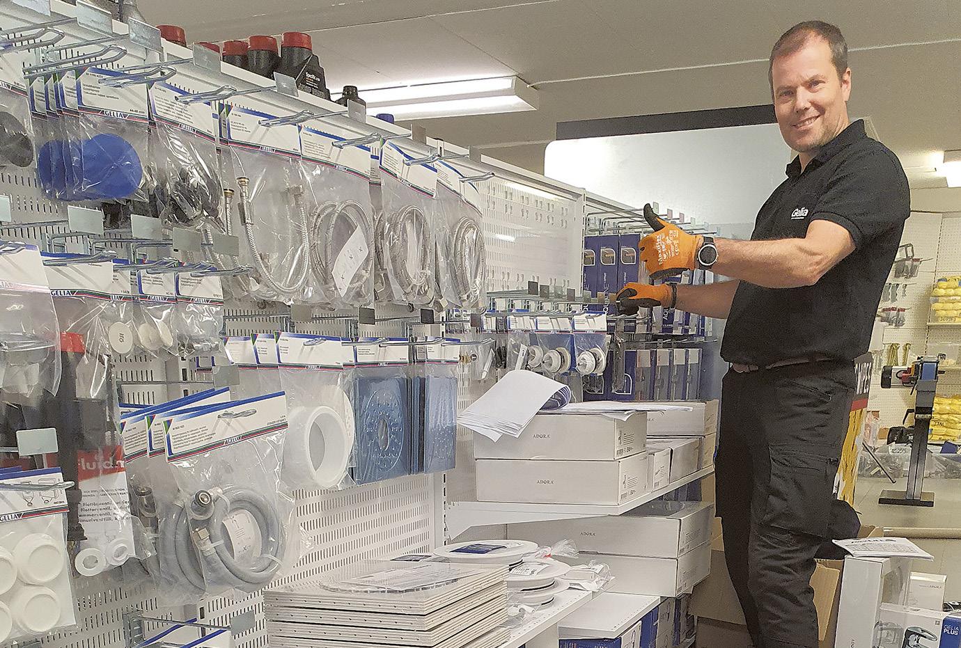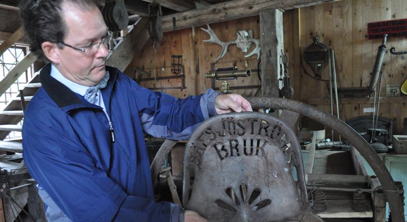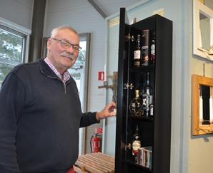 Christer Lundén visar olika fantasifulla träprodukter. Här ett vedskåp med oväntat innehåll.