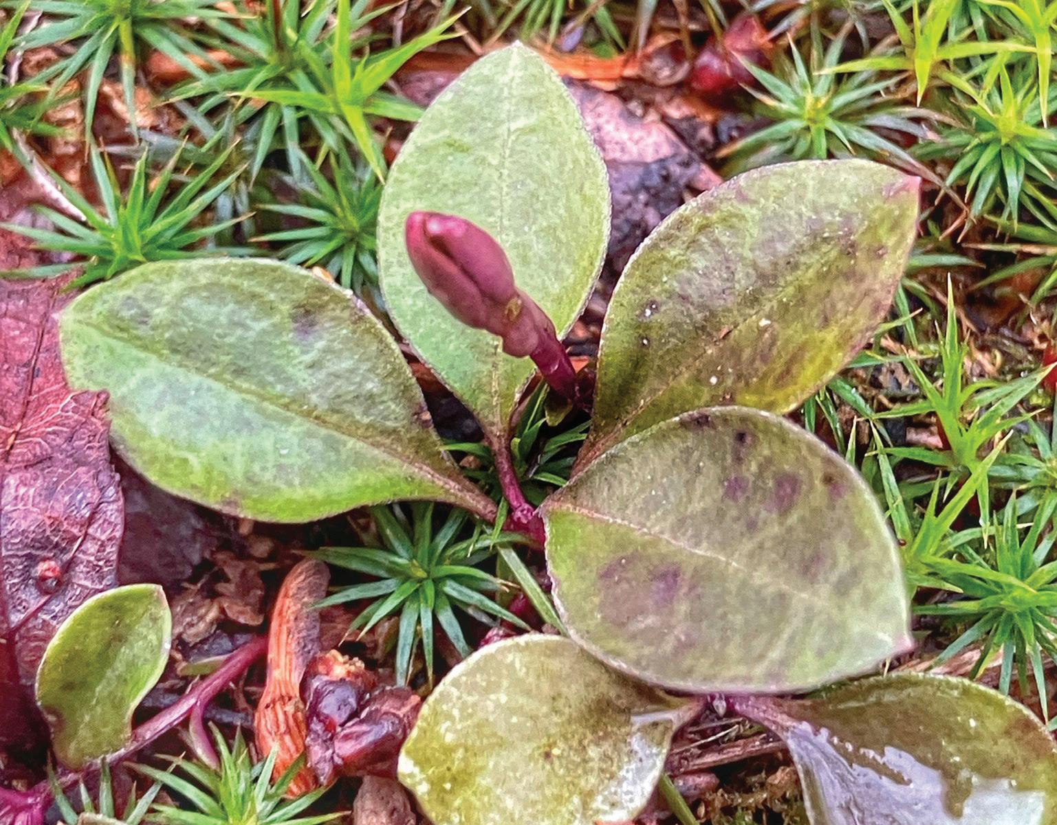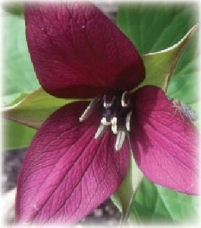 just inside the tree line. It is quite steep, but well worth the exertion of climbing. As we enter what is primarily deciduous woods—think red oaks, hophornbeams, red and sugar maples, for the most part, with a smattering of white pines—I spot a fleshy dark green stalk near a downed tree, with three pointed leaves evenly spaced around it in a whorl. Rising above the whorl, a white, three-petaled flower nods, its three green sepals a sharp contrast between each petal. A few paces beyond is the same flower, a bit more open, this one facing upwards, revealing golden stamens and pistils in its throat. Trillium grandiflorum (great white trillium), which, I’m sure your botanical use of Latin can deduce is named for having plant parts in groups of three, is an eye-catching ephemeral, and can often be seen from quite a distance when in bloom. I’ll caution you though, as much as we love to bring blooms back to enjoy, that trillium is, in many areas, a protected species. Additionally, because each plant only sends one bloom up for a short time,