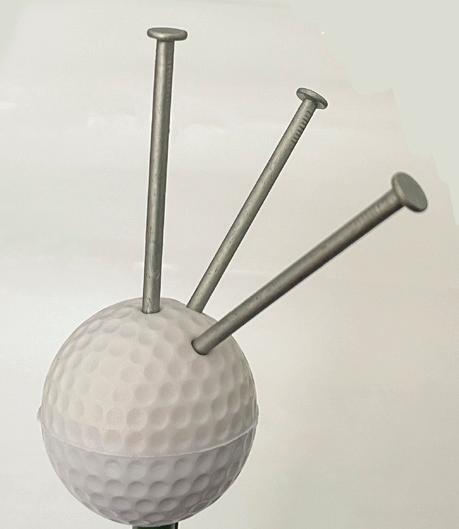 4. Find the dimple at the top of the golf ball opposite stake hole and push in a nail about 1/4 inch deep. Push another nail into ball about two or three dimples away from first nail. Repeat, adding nails in this fashion all around ball, leaving at least a two dimple buffer around the hole you created on the bottom.