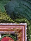 Glidden’s Warm Mahogany, a deep red-brown, is amplified through richly colored selections like heucherella ‘Redstone Falls’, heuchera ‘Fire Alarm’ and Norhern Exposure ‘Red’, begonia T Rex ‘Stardust’, and heucherella ‘Solar Eclipse,’ each bringing saturated depth to garden compositions.