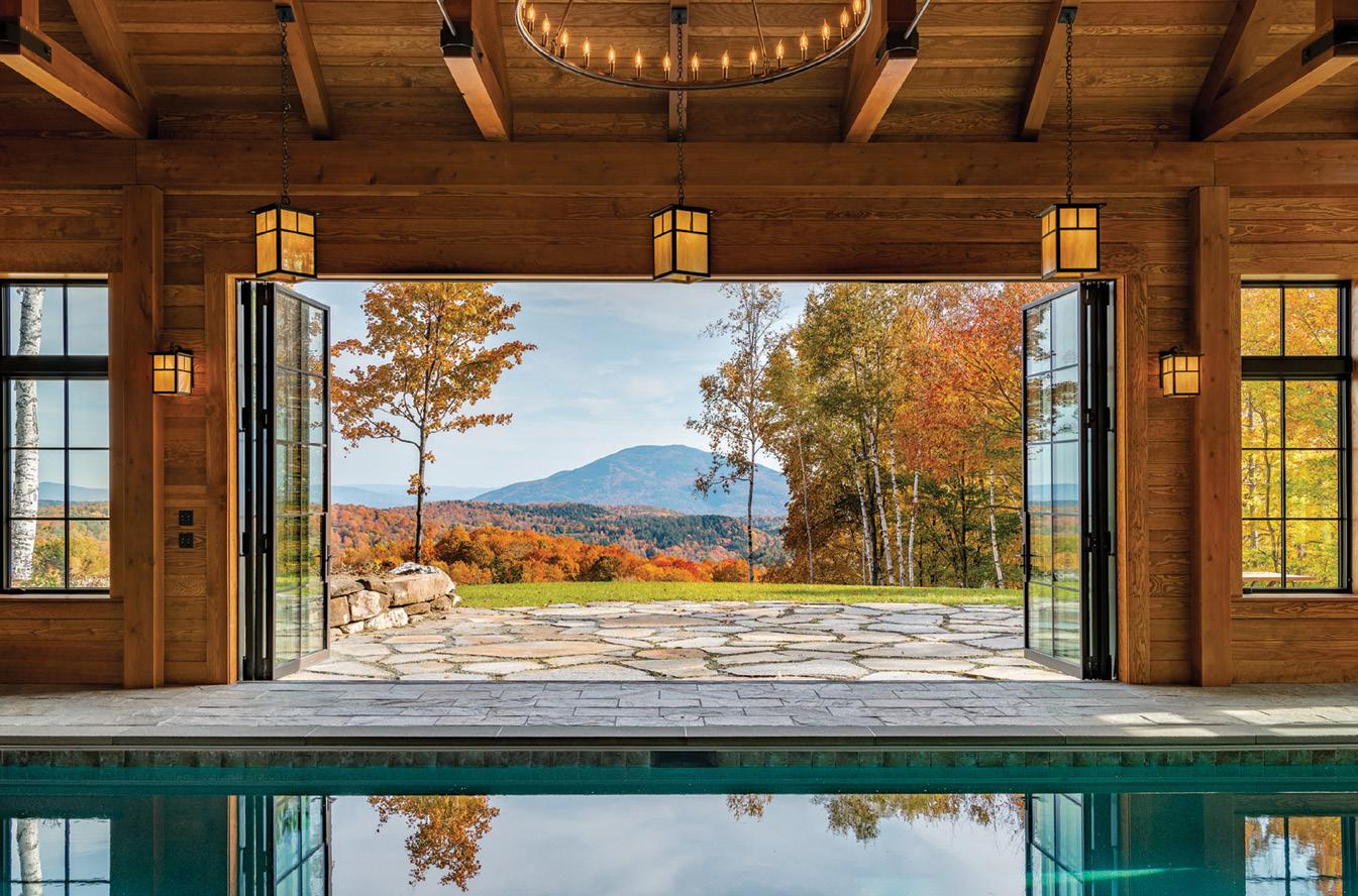 Clothes on or off, the home became a four-season haven for the Maltz family. An oversized stone fireplace in the rustic, timber-framed manor house and another in the lakeside lodge were perfect for family game nights or curling up with a book in winter. Many meals were shared in the manor ’s formal dining room or lakeside, on the lodge’s wraparound deck. Canoe trips were launched from the dock, which was also the ideal spot for plunging into the lake when the weather turned warm. “Since I was a kid, this has been one of my favorite places to come and relax,” says Maltz. “The way that the house interacts with the lake which interacts with the forest is the perfect combination of privacy and adventure.”