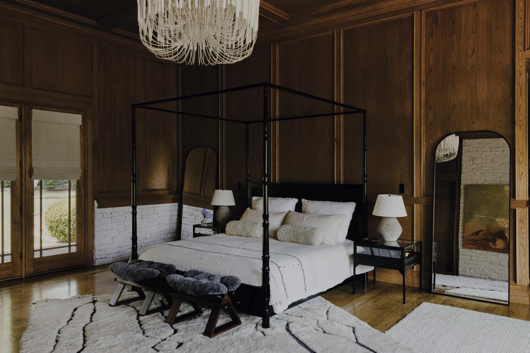 Above: In the main house’s primary bedroom, the team balanced the rich wood paneling with softness, adding a custom Moroccan rug by MK Objects, a camel sheepskin sofa, and a canopy bed by Four Hands.