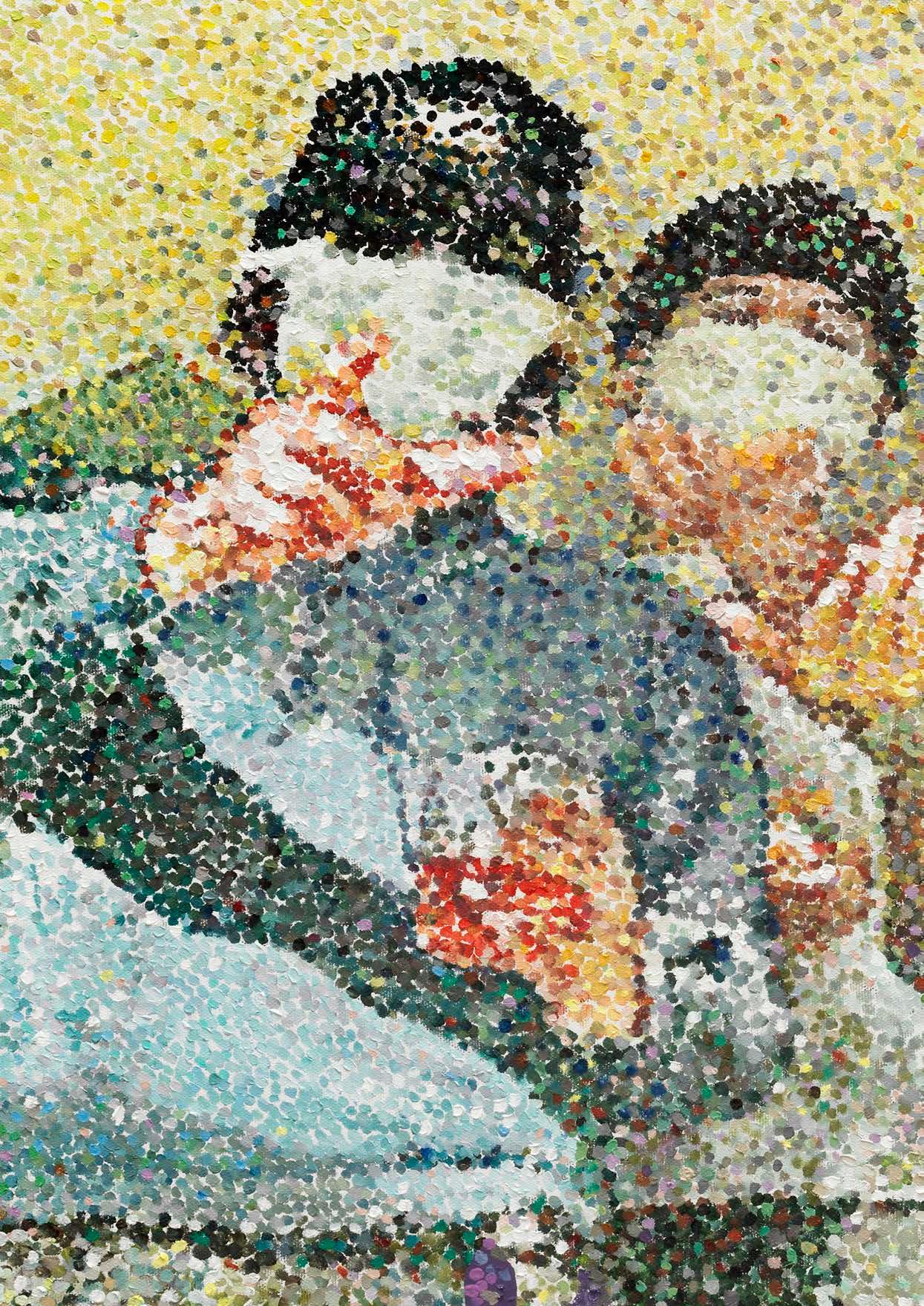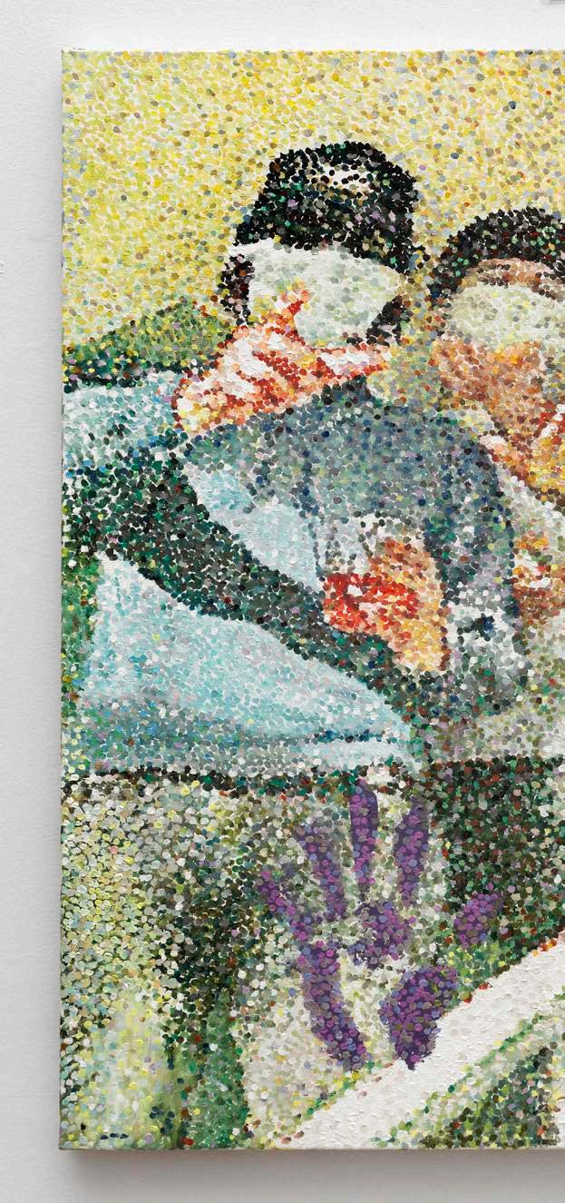 In his current work, he explores pointillism and its connections to scientific and technological developments. Like screens, pointillist works are built from small dots that, at a distance, merge into a coherent image. Each dot, comparable to a pixel, only gains meaning as part of a larger whole. This visual language offers Palframan a framework for reflecting on fragmentation, identity, and how visibility is constructed.