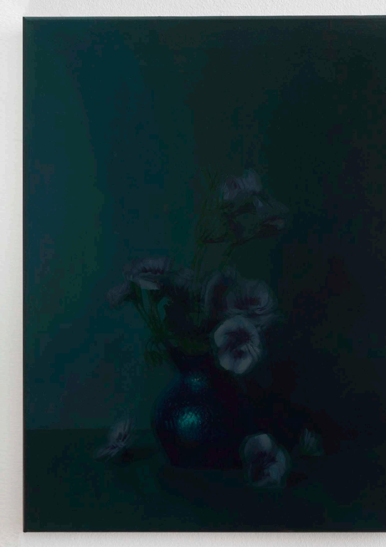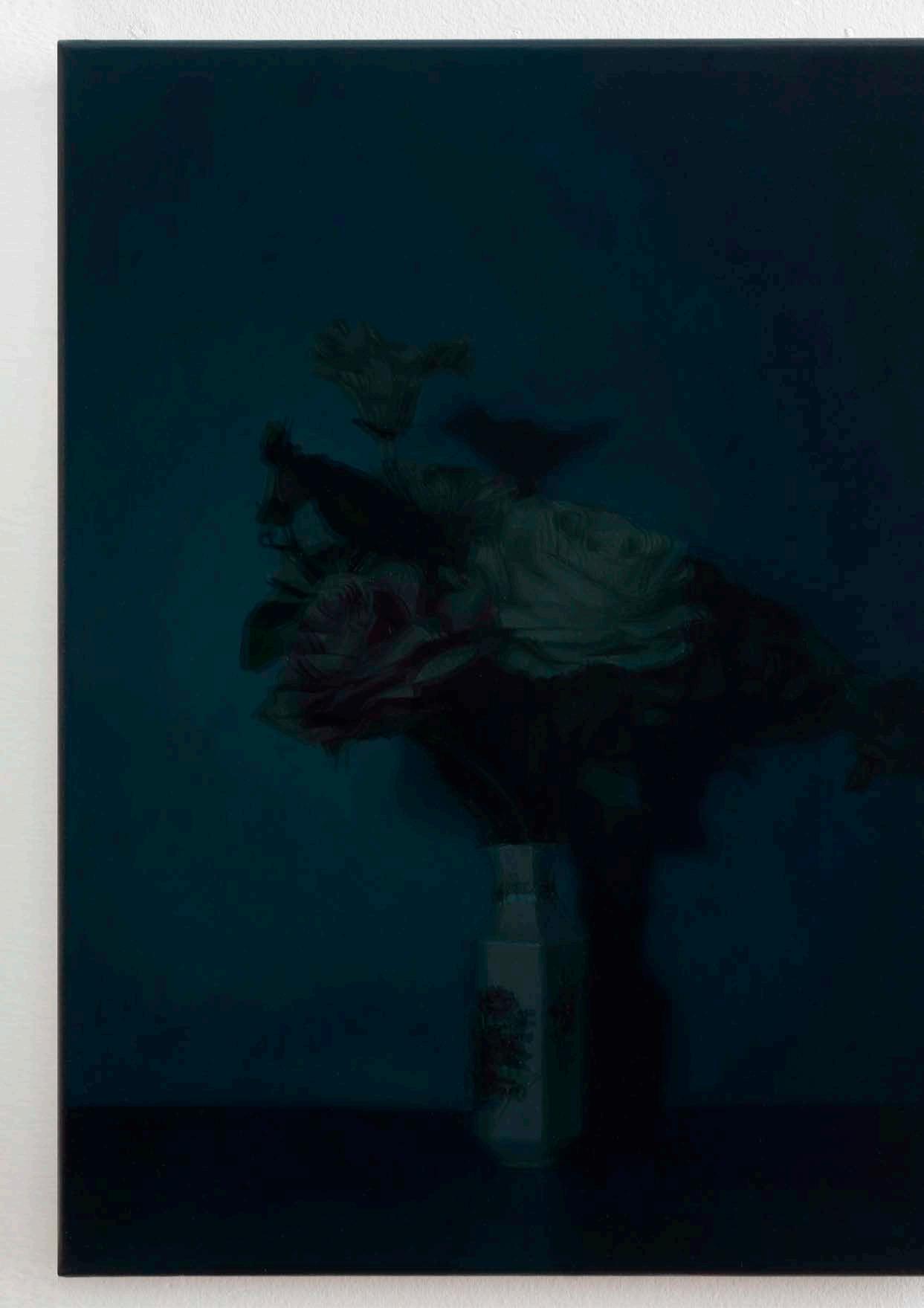 This is reflected in his near-monochrome flower paintings, whose true form only gradually becomes visible. They appear and disappear from view, elusive and out-of-focus reflections that refuse to submit to the viewer’s gaze.