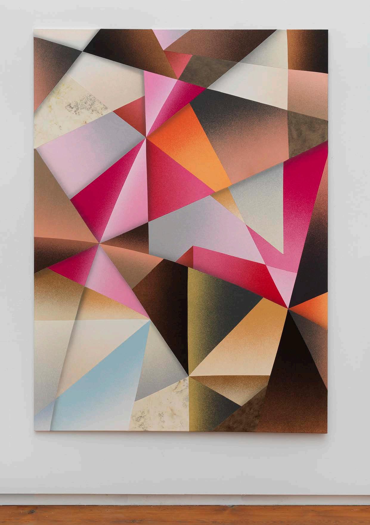 His painting practice stems from a fascination with the tactile, imperfect experience that painting offers, in contrast to the limitless control of digital media. Using a roller and diluted paint, he builds up layers that create depth and texture, with colour often serving as an intuitive starting point. His figuration is minimal and functions as an abstract language, reducing recognisable forms to their essence.