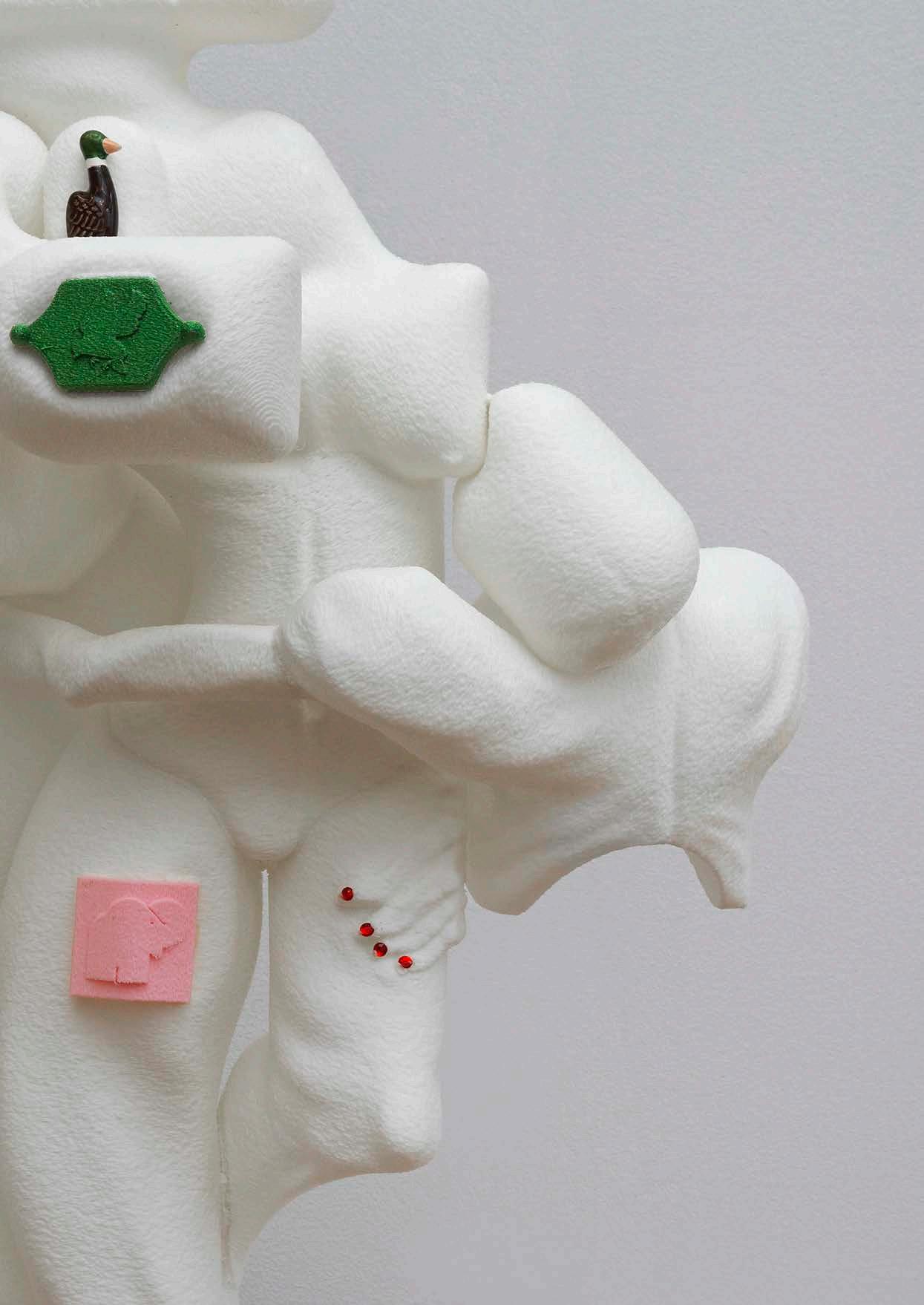 His hybrid, 3D-printed sculptures are physical manifestations of digitally created figures that regularly appear throughout his practice. To these sculptures he adds found objects and paint, giving each work authentic qualities and turning it into a unique object. The figures thus travel through both digital and physical environments. The sculptures demonstrate that digital and physical layers form part of the same reality, constantly in dialogue with one another.