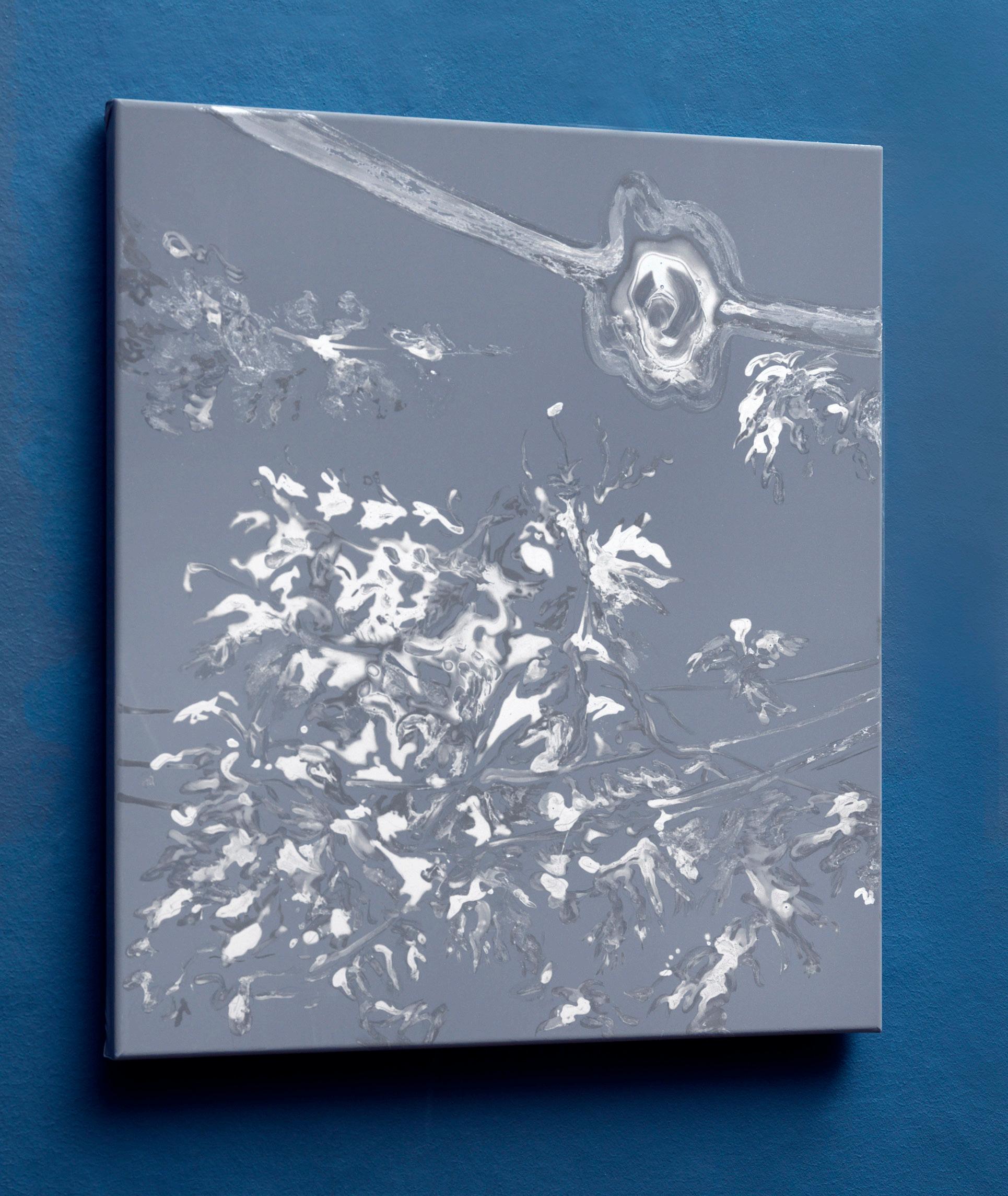 Acrylic medium, heavy water and acrylic paint on reflexive fabric