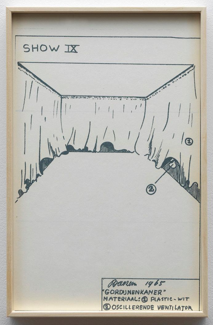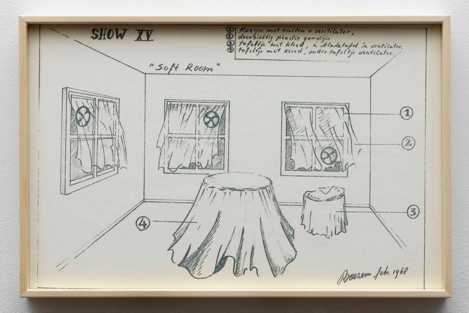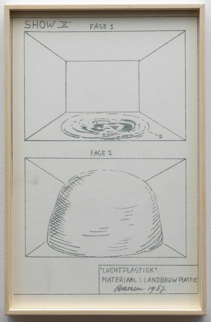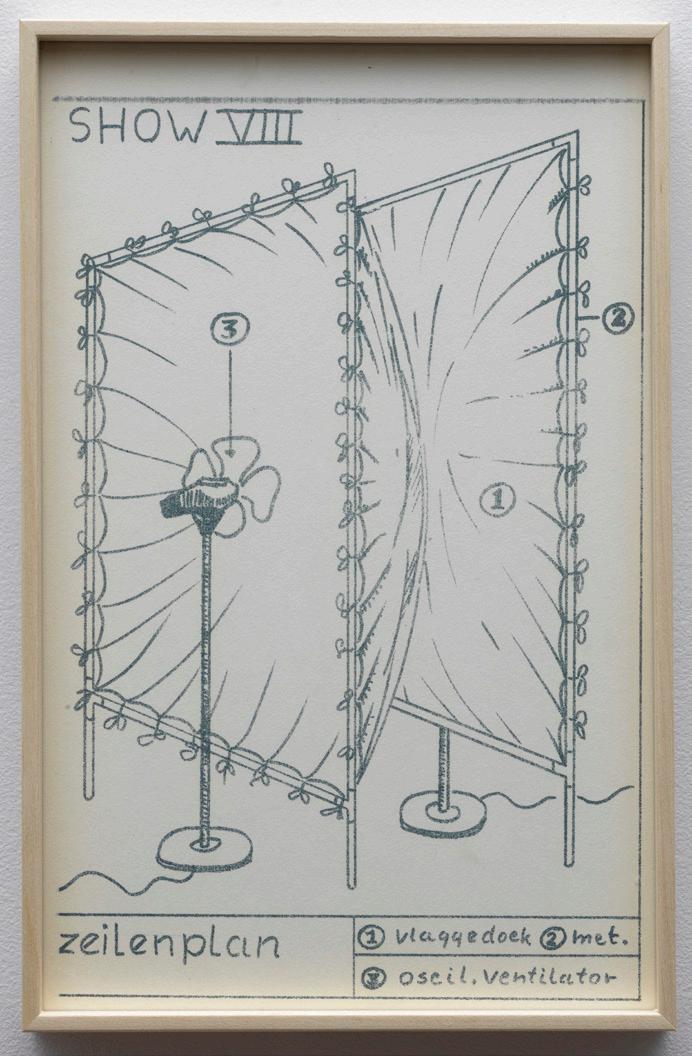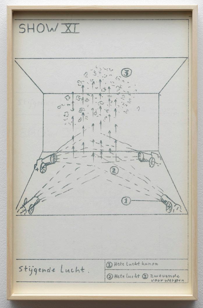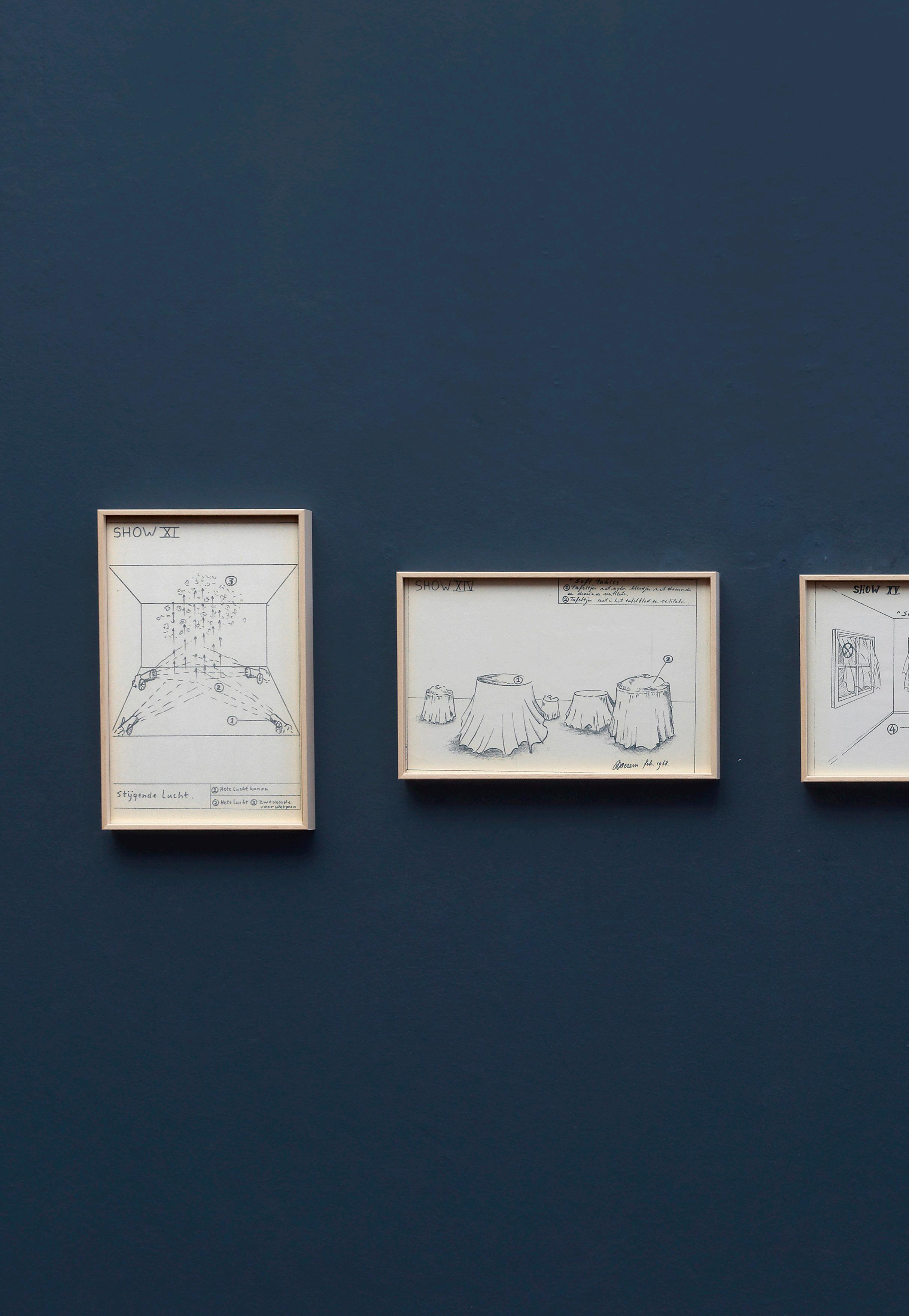 Marinus Boezem’s Shows form a coherent series of drawings intended as proposals for installations which could be realized in a museum on order. The proposals consist of spatial sculptures made of air and other materials, such as cotton, wool and reeds, hardly ever used for art at the time. The Shows were proposals for what became known in the second half of the eighties as ‘installations’: working with the whole of the exhibition space.