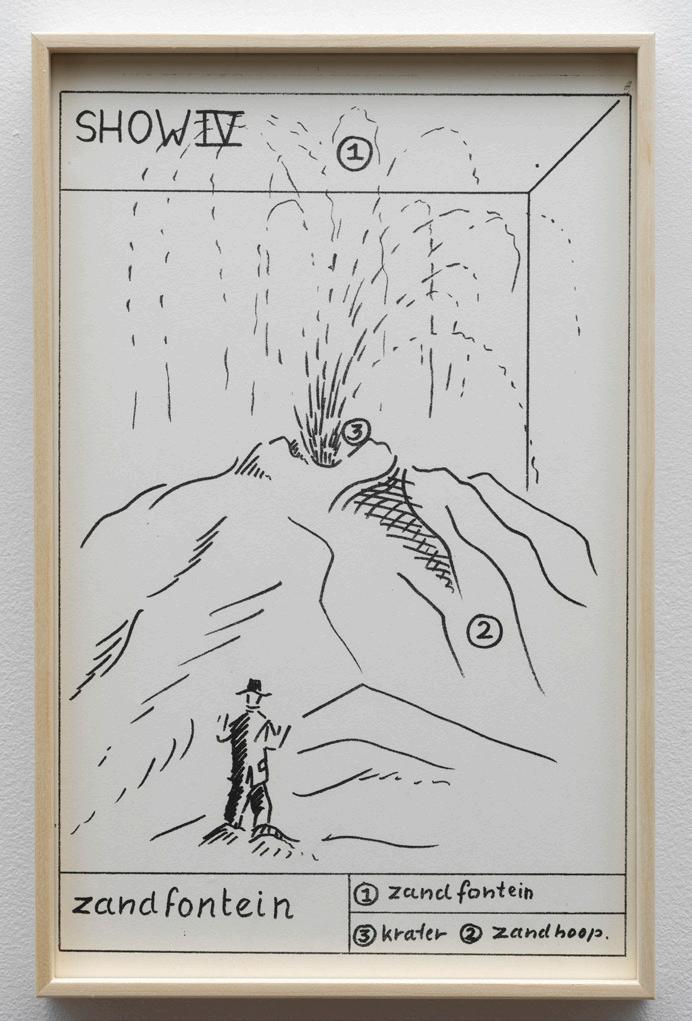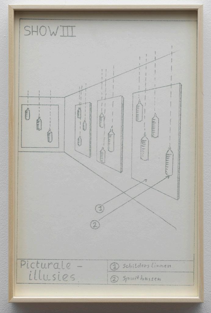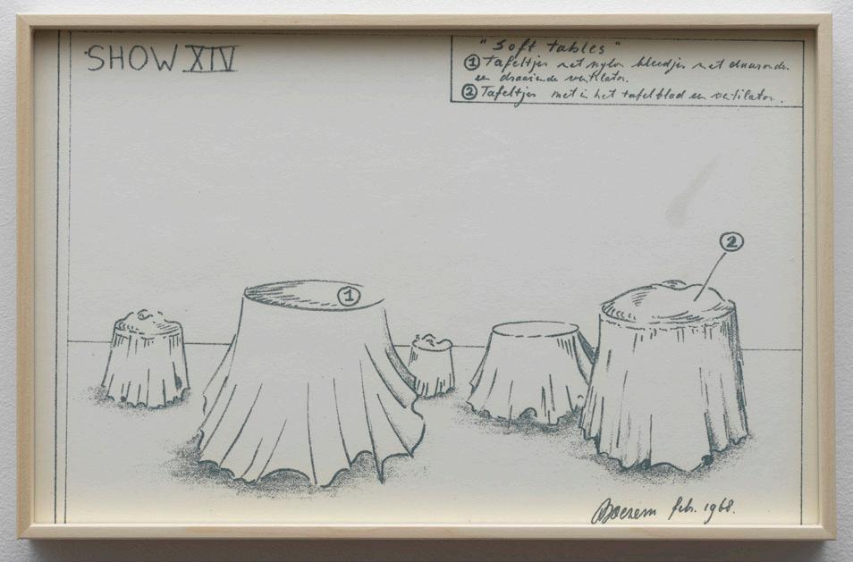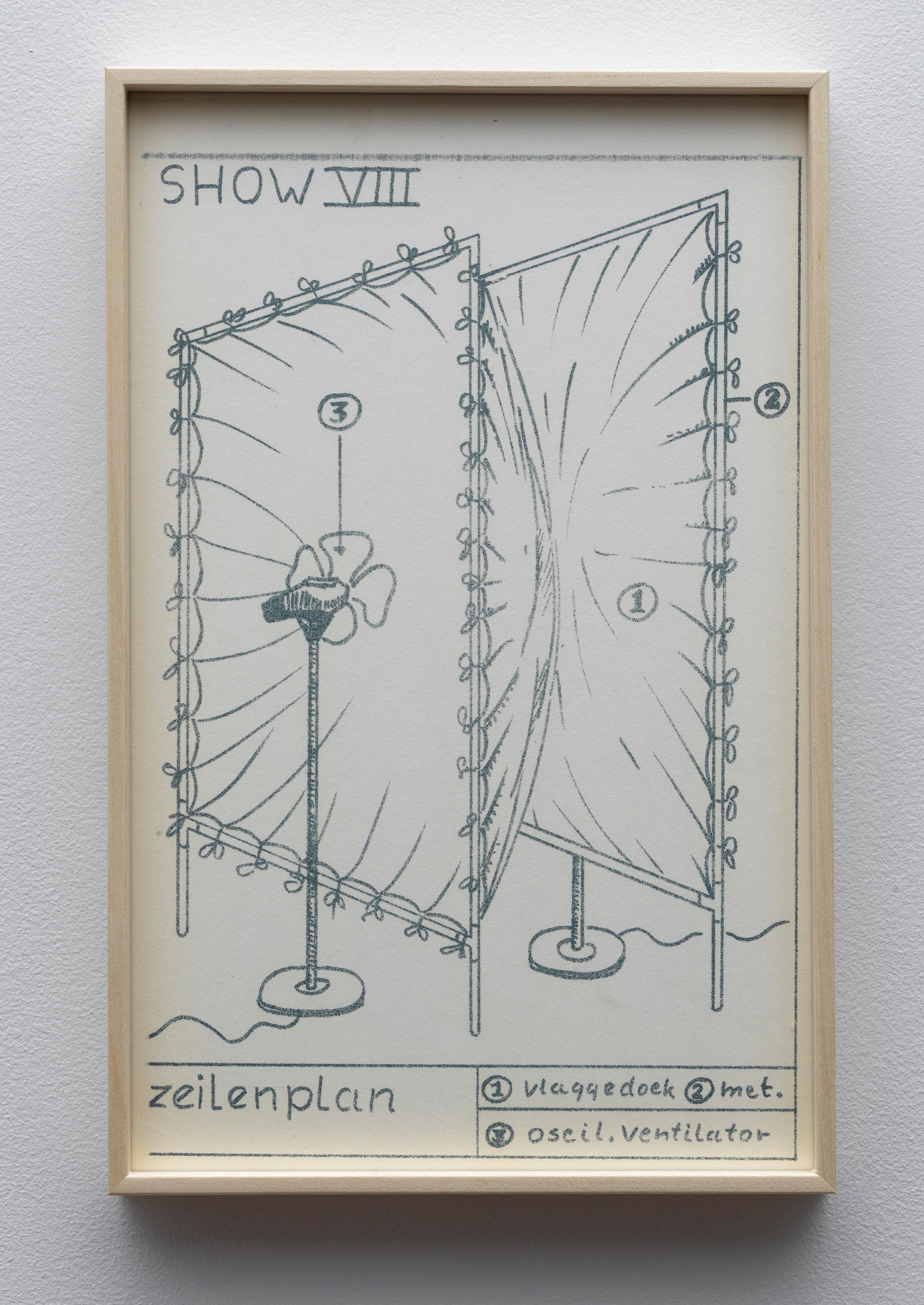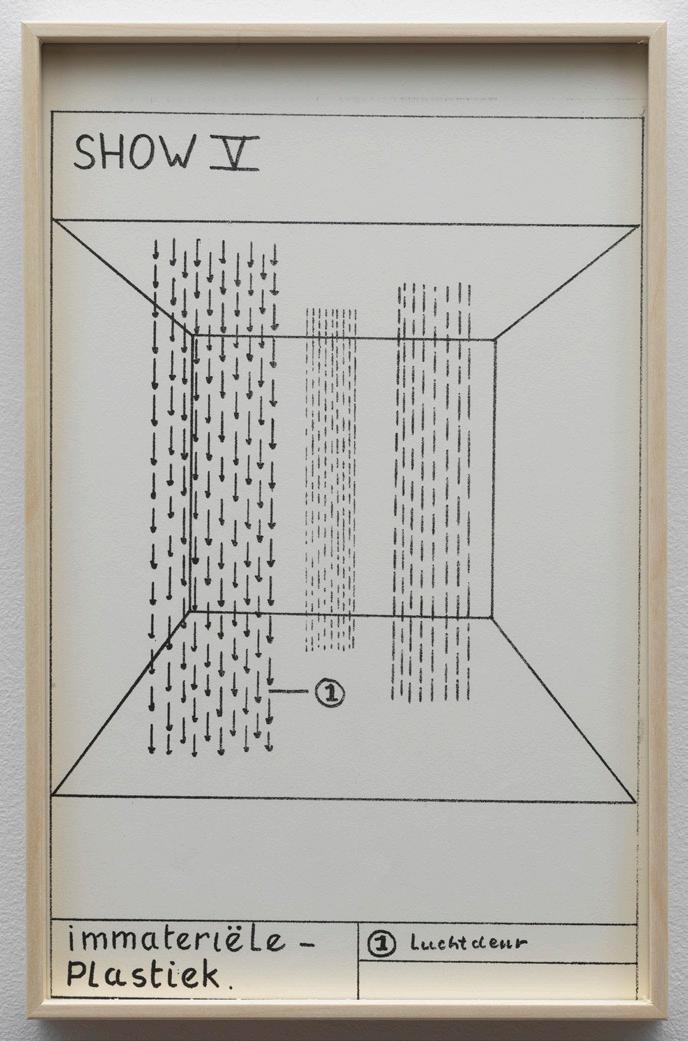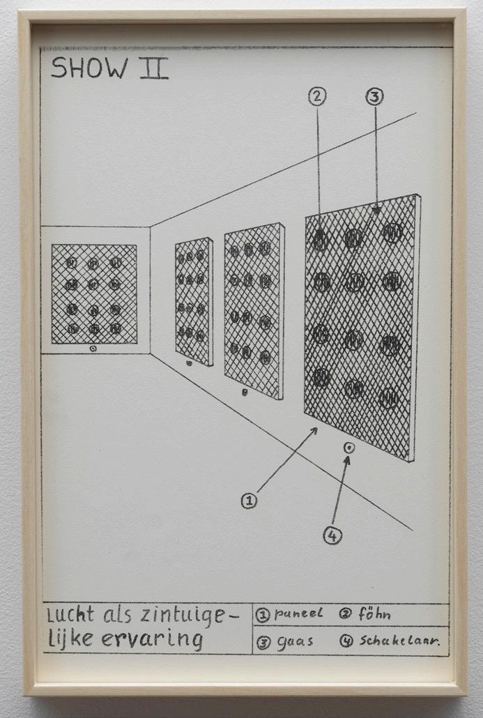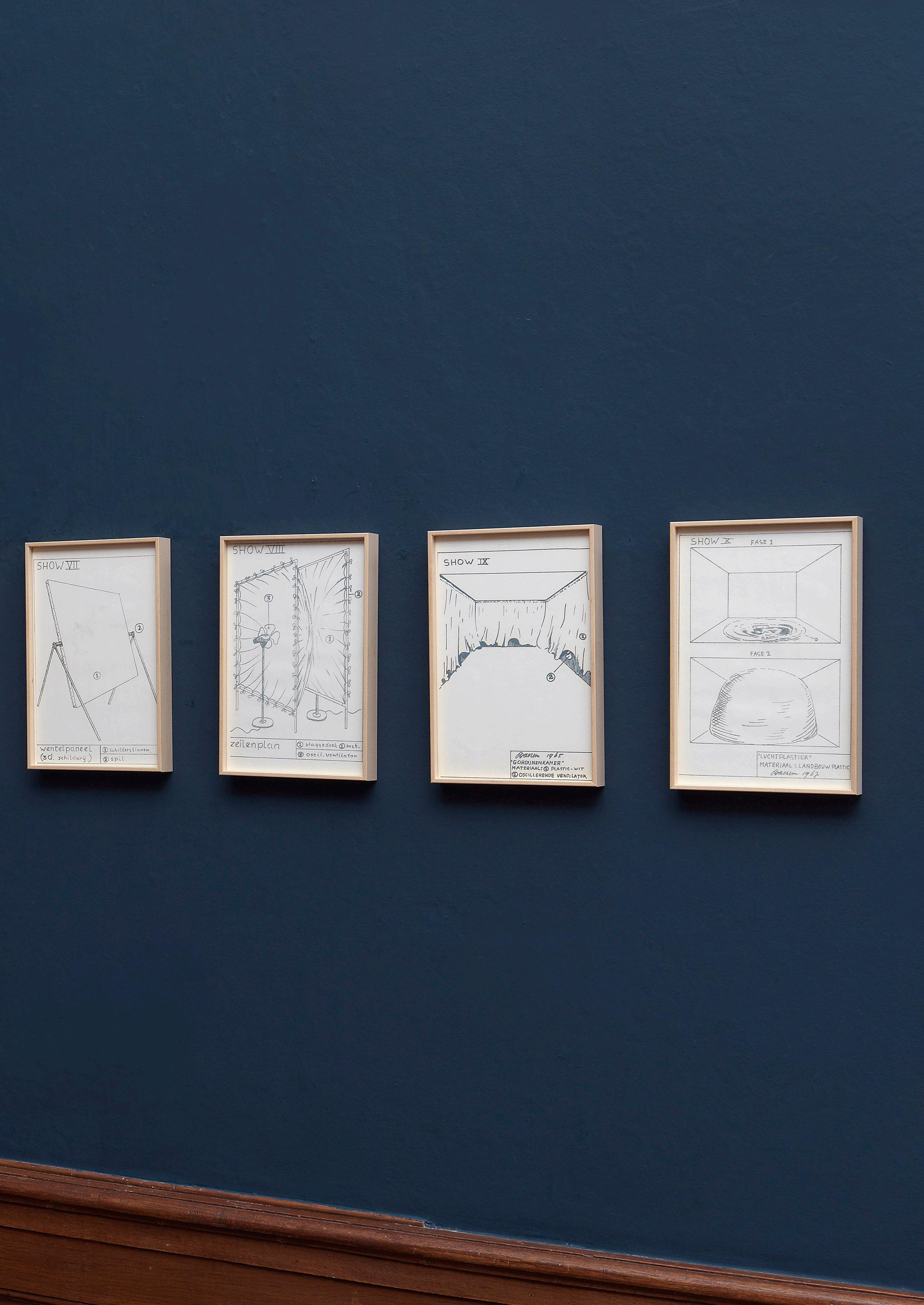 Marinus Boezem’s Shows form a coherent series of drawings intended as proposals for installations which could be realized in a museum on order. The proposals consist of spatial sculptures made of air and other materials, such as cotton, wool and reeds, hardly ever used for art at the time. The Shows were proposals for what became known in the second half of the eighties as ‘installations’: working with the whole of the exhibition space.