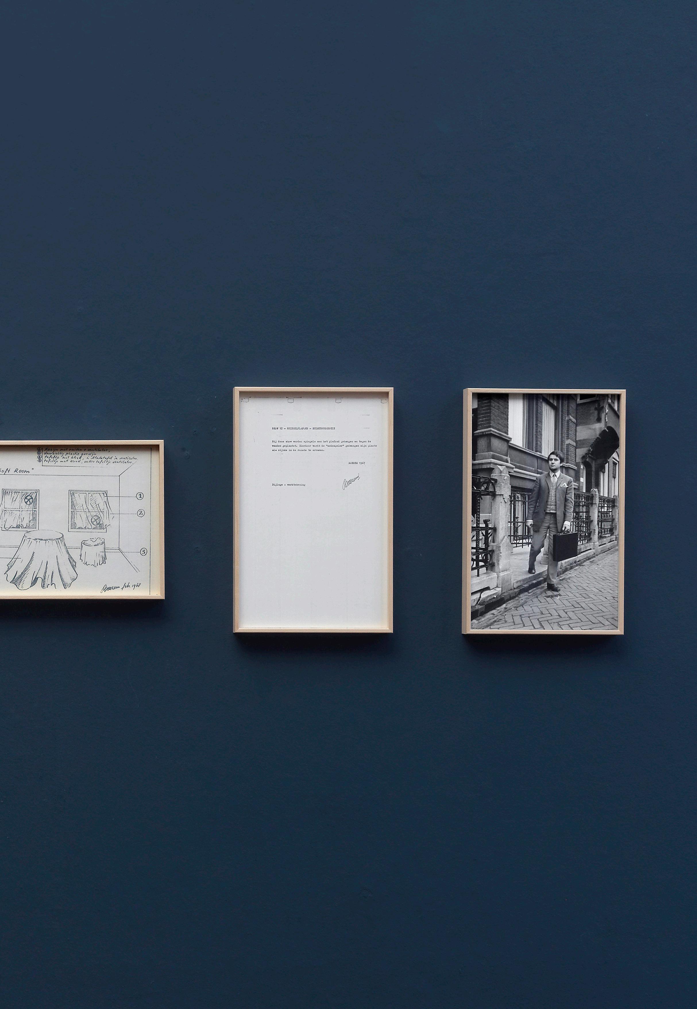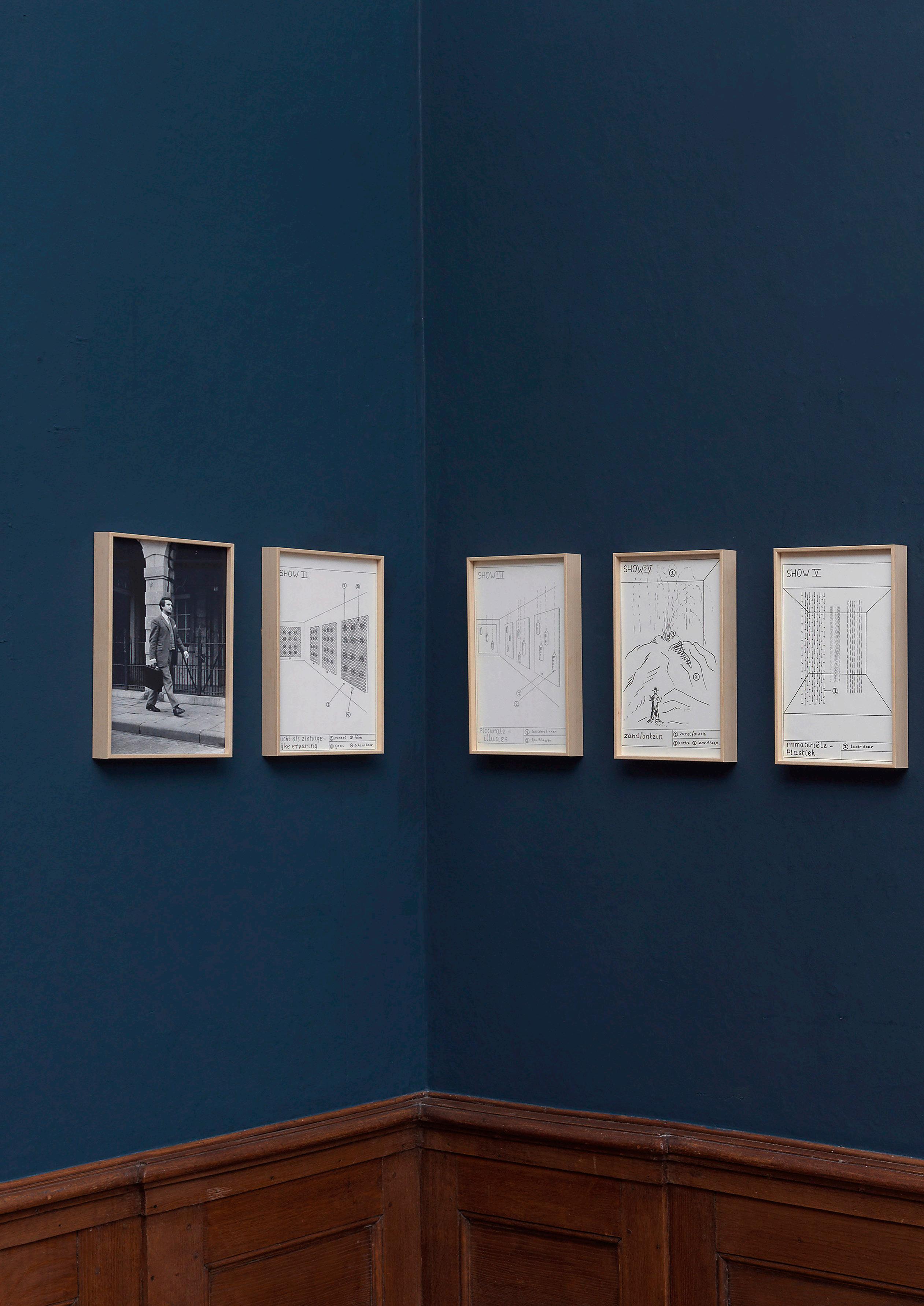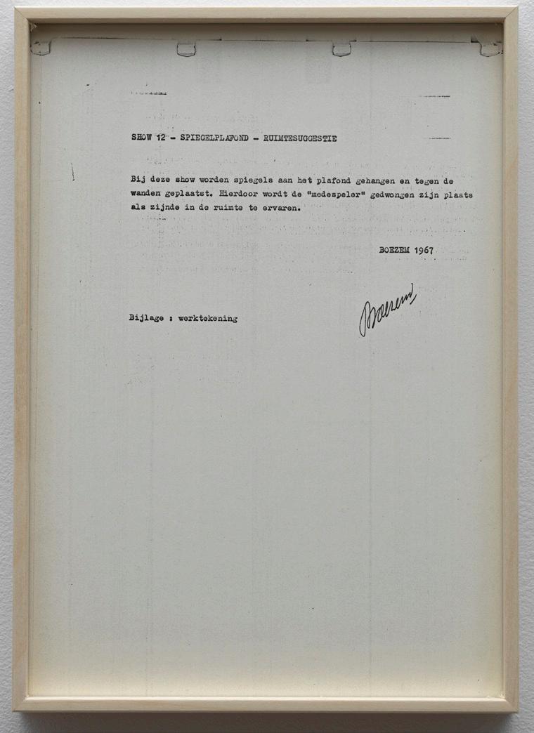 Like a businessman dealing in art ideas, Boezem wore a threepiece suit and carried a briefcase containing his proposals, which he brought to museums in person or distributed to people in art circles. A number of the Shows were realized partially or in full since their conception. In 2021, an exhibition at the KröllerMüller Museum brought all the Shows to life for the first time. This artwork contains 14 pieces, including Shows XI–XV, a typescript, and two photographs of Boezem with his briefcase.