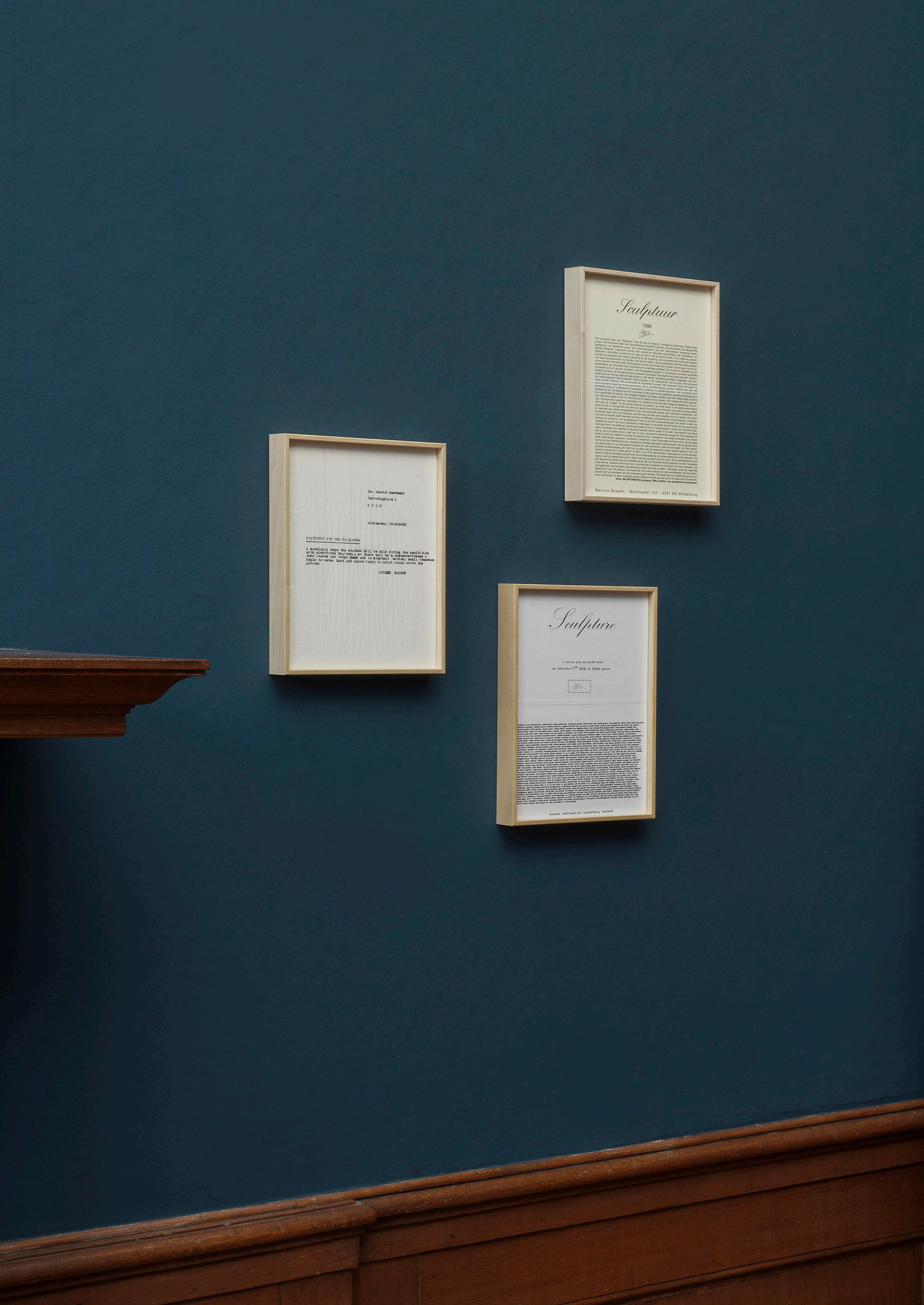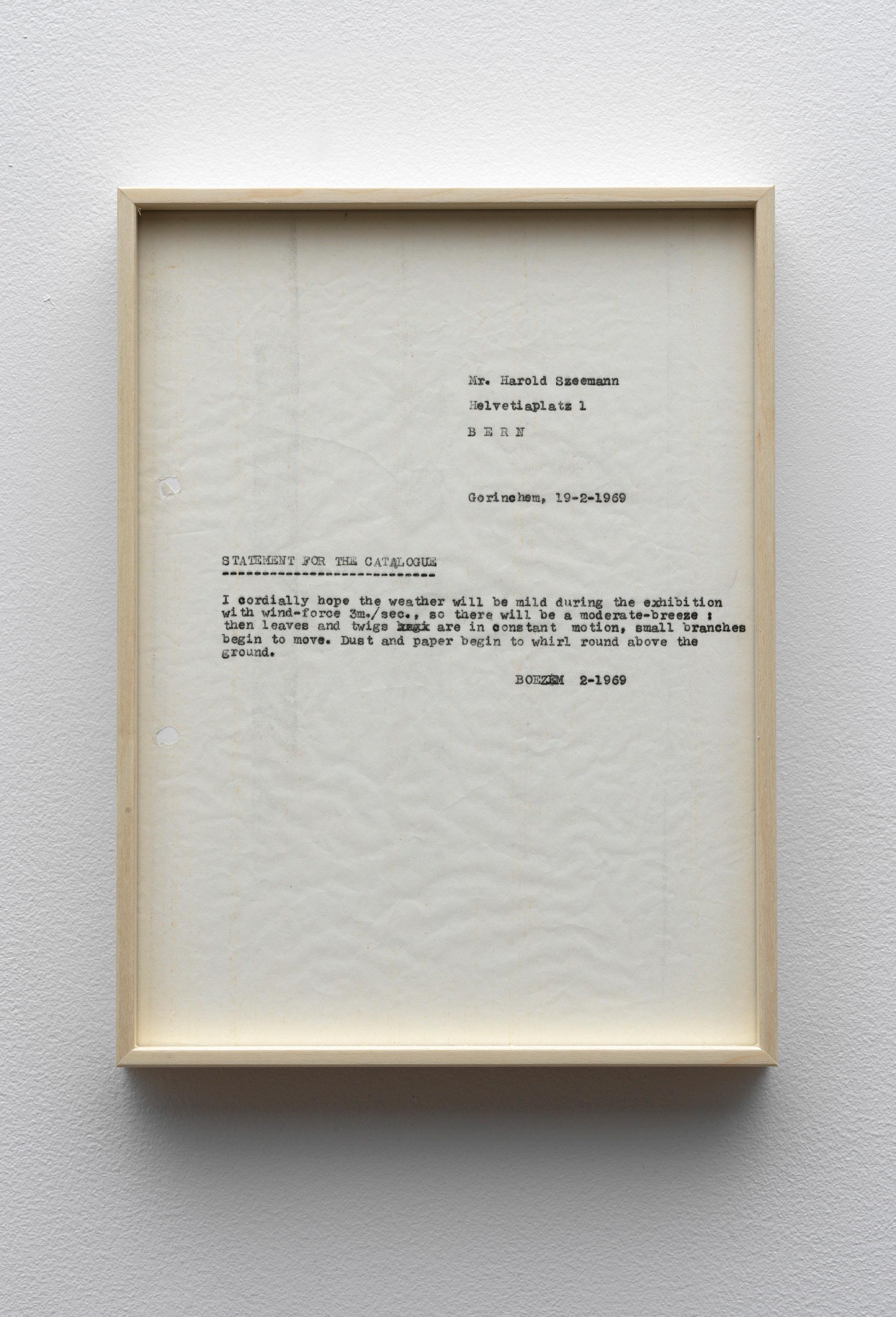 Brought together for the first time, this presentation surveys a body of historical works by Boezem that can be classified as mail art, an artistic movement that emerged in the 1960s centered on the exchange of small-scale works through the postal service. Boezem, celebrated for his radical immaterial, conceptual and Arte Povera works, regularly used the postal service to distribute his art and ideas. Sending art directly into the world, to institutions, artists or art professionals, was itself a conceptual gesture entirely in keeping with his practice. The works gathered here span more than three decades and include an exhibition invitation, proposals for artworks and weather reports, among others. All works bear the playful sensibility so characteristic of Boezem’s work.