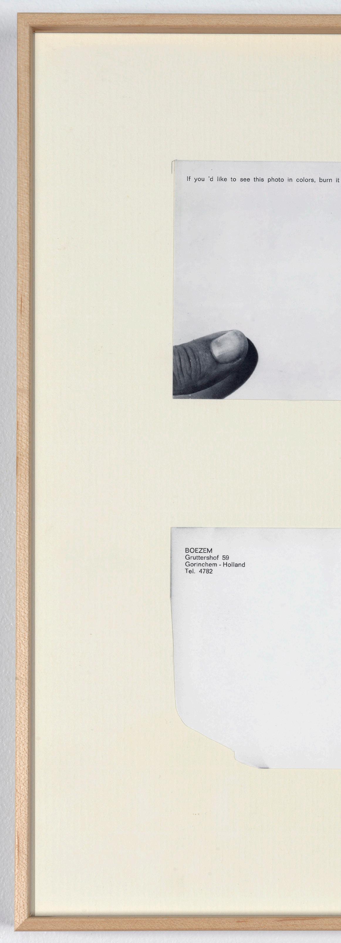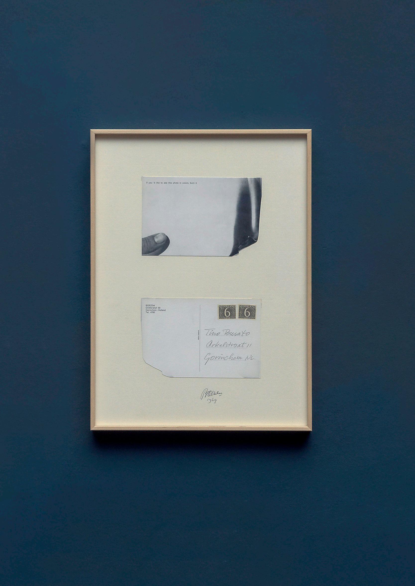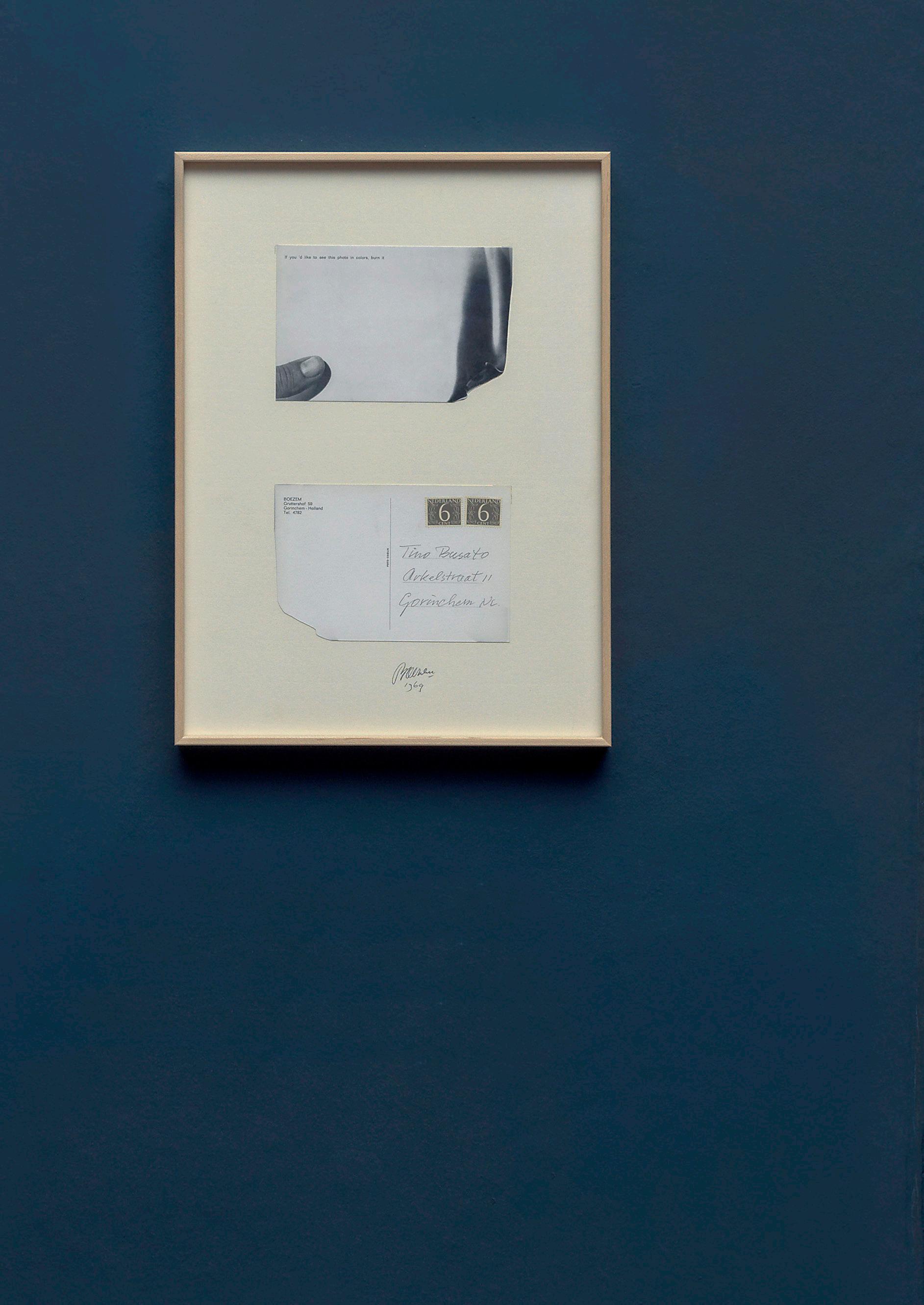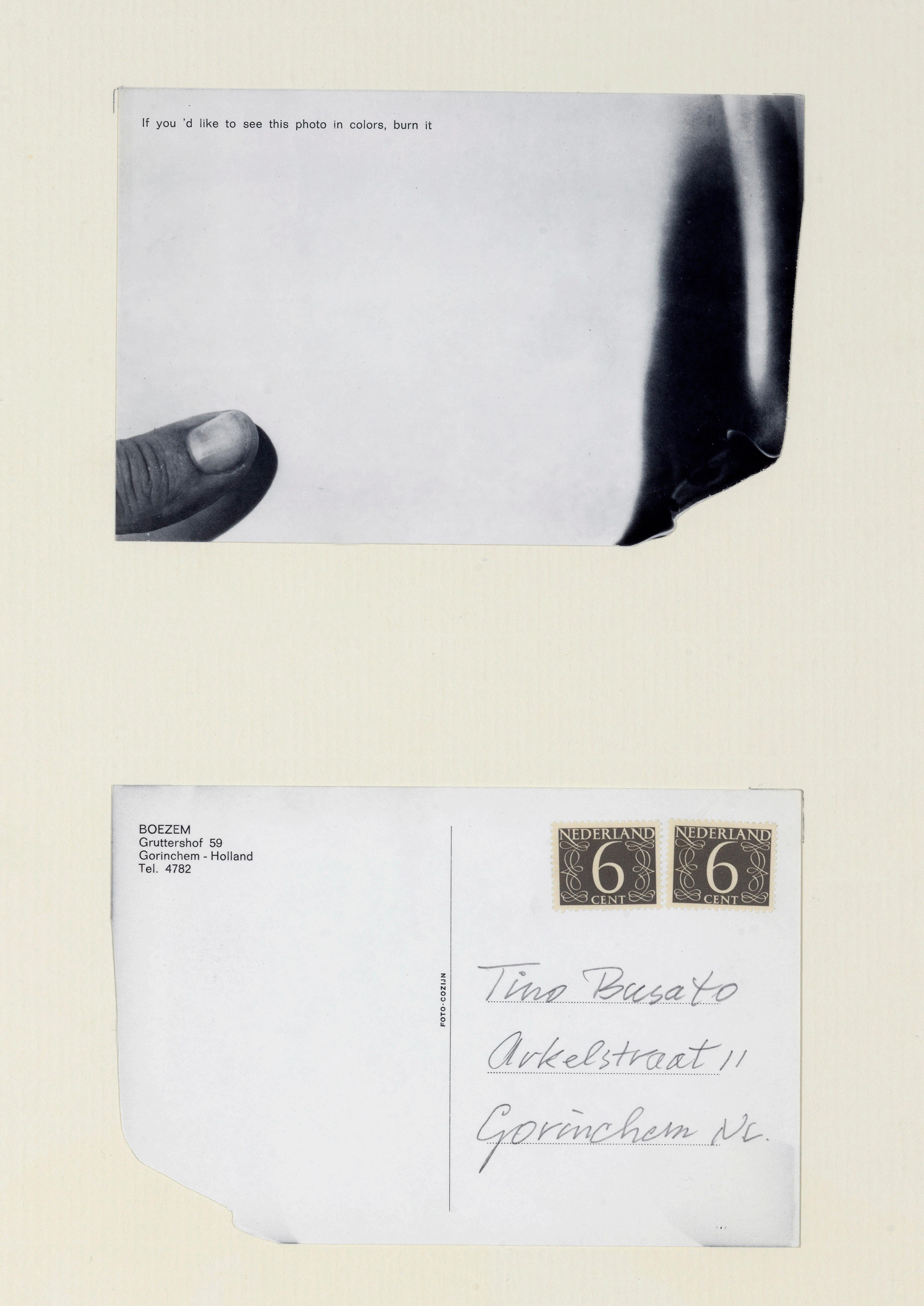 This work is a black and white picture postcard bearing the instruction: ‘If you’d like to see this photo in colors, burn it.’ Boezem’s thumb is pictured life-sized in the left corner, as if holding the card, while the right side depicts a curling sheet of paper going up in flames. In 1969 the card was sent by mail to 200 persons as an artwork. The recipient is involved as a co-actor in the creation of the intended artwork, by holding it in the spot where Boezem’s thumb is pictured and then lighting it on fire. By this intervention, the black and white photograph of the flames is temporarily transformed into the colour of real flames. At the same time, the realization of the artwork means its destruction.