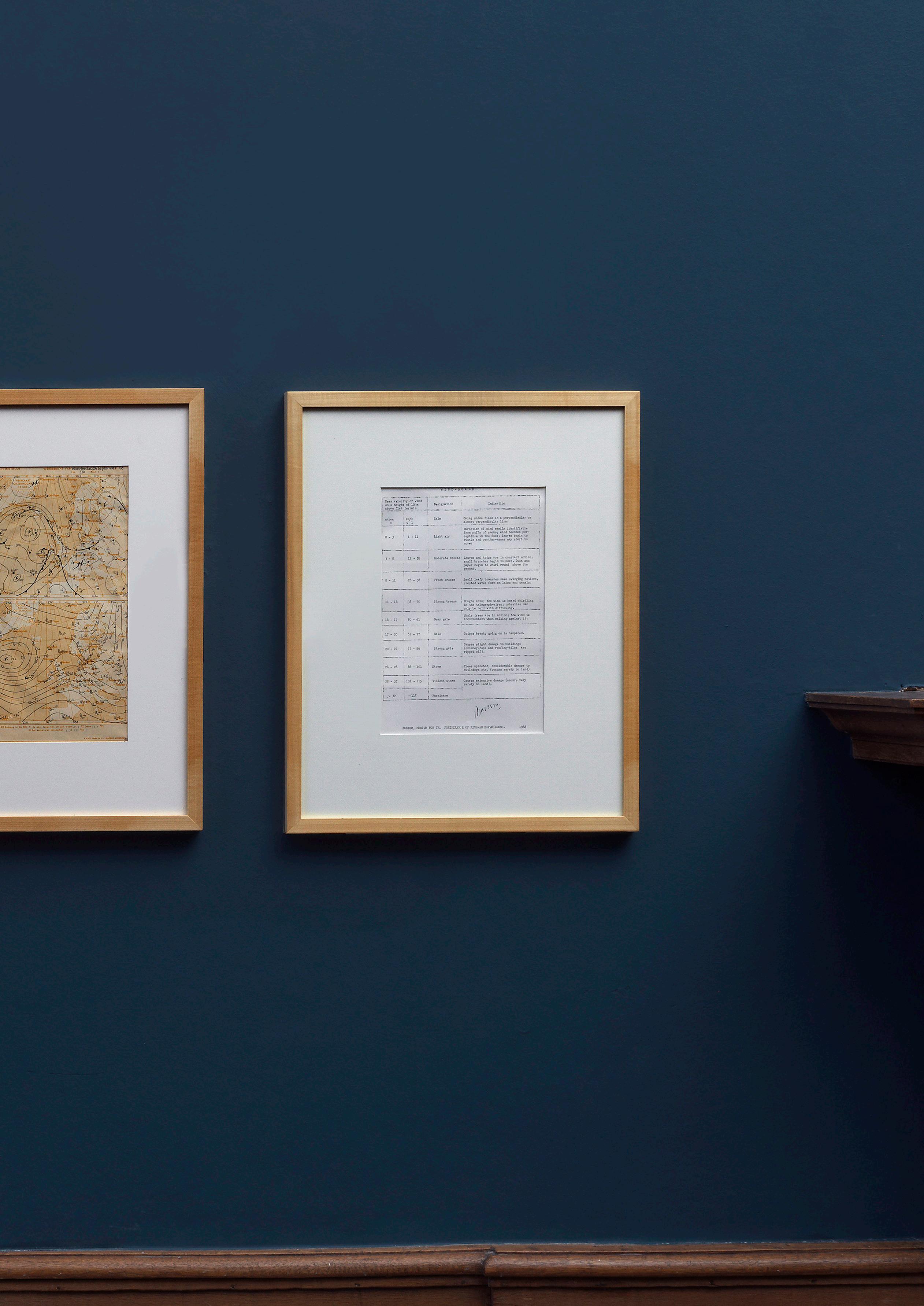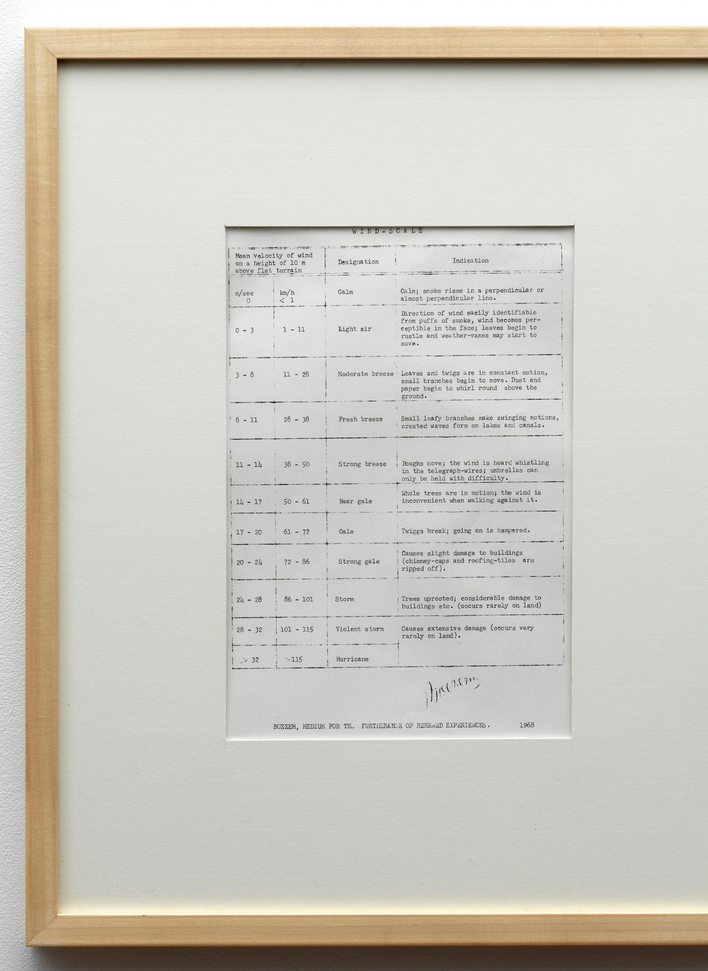The Wind Scale is a slightly modified version of the official Beaufort Scale, the numerical wind speed system running from 0 (calm) to 12 (hurricane), taken from the Dutch version used by the KNMI at the time. It was sent as an enclosure with the Weather Map for September 26, 1968, to individuals and institutions in art circles, signed ‘Boezem Medium Ter Bevordering Van Hernieuwde Ervaringen’ (Boezem, Medium For The Furtherance of Renewed Experiences), 1968.The work was shown in several landmark exhibitions, including Arte Povera, Amalfi (1968), Op Losse Schroeven (1969), and When Attitudes Become Form, Bern (1969).