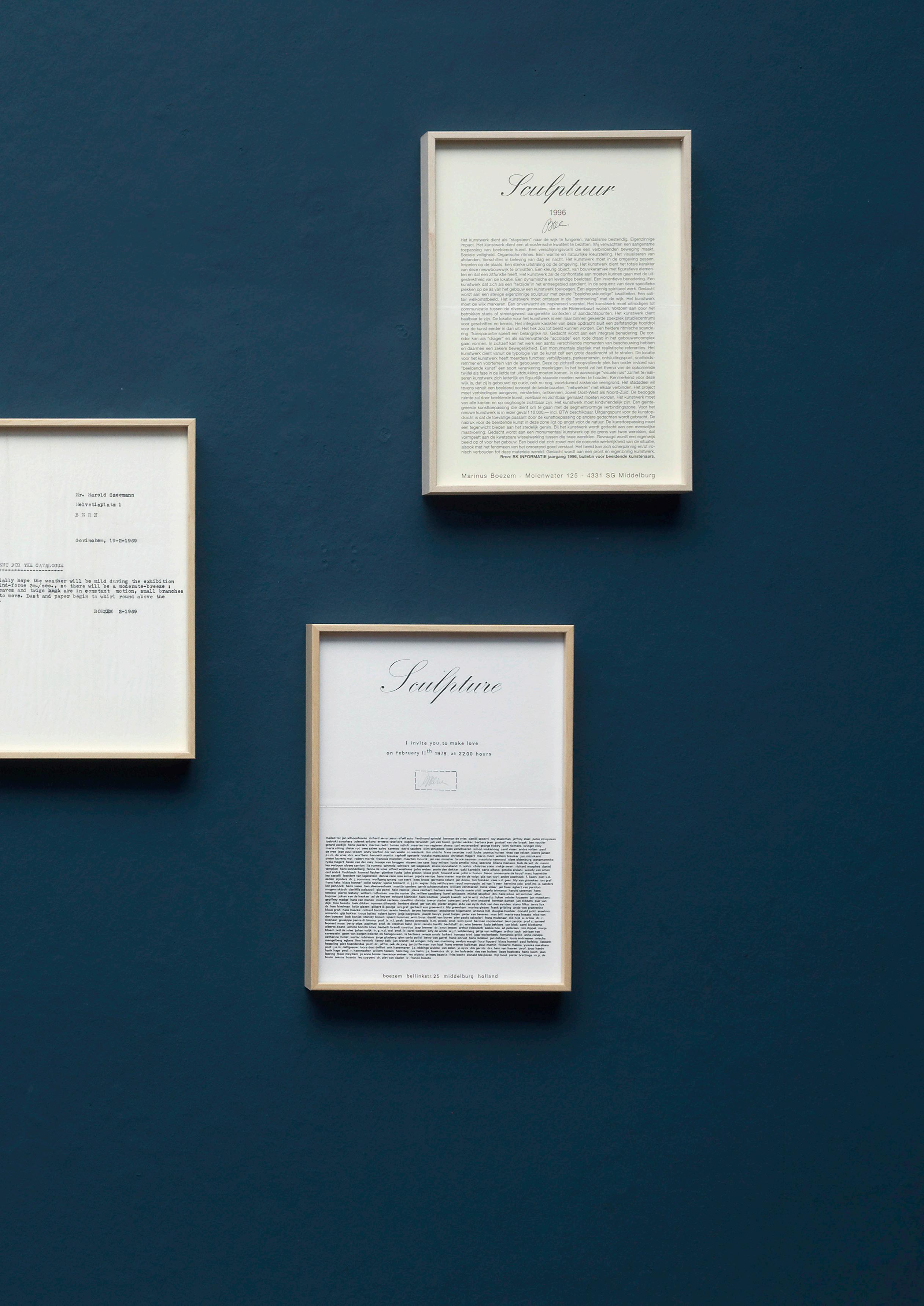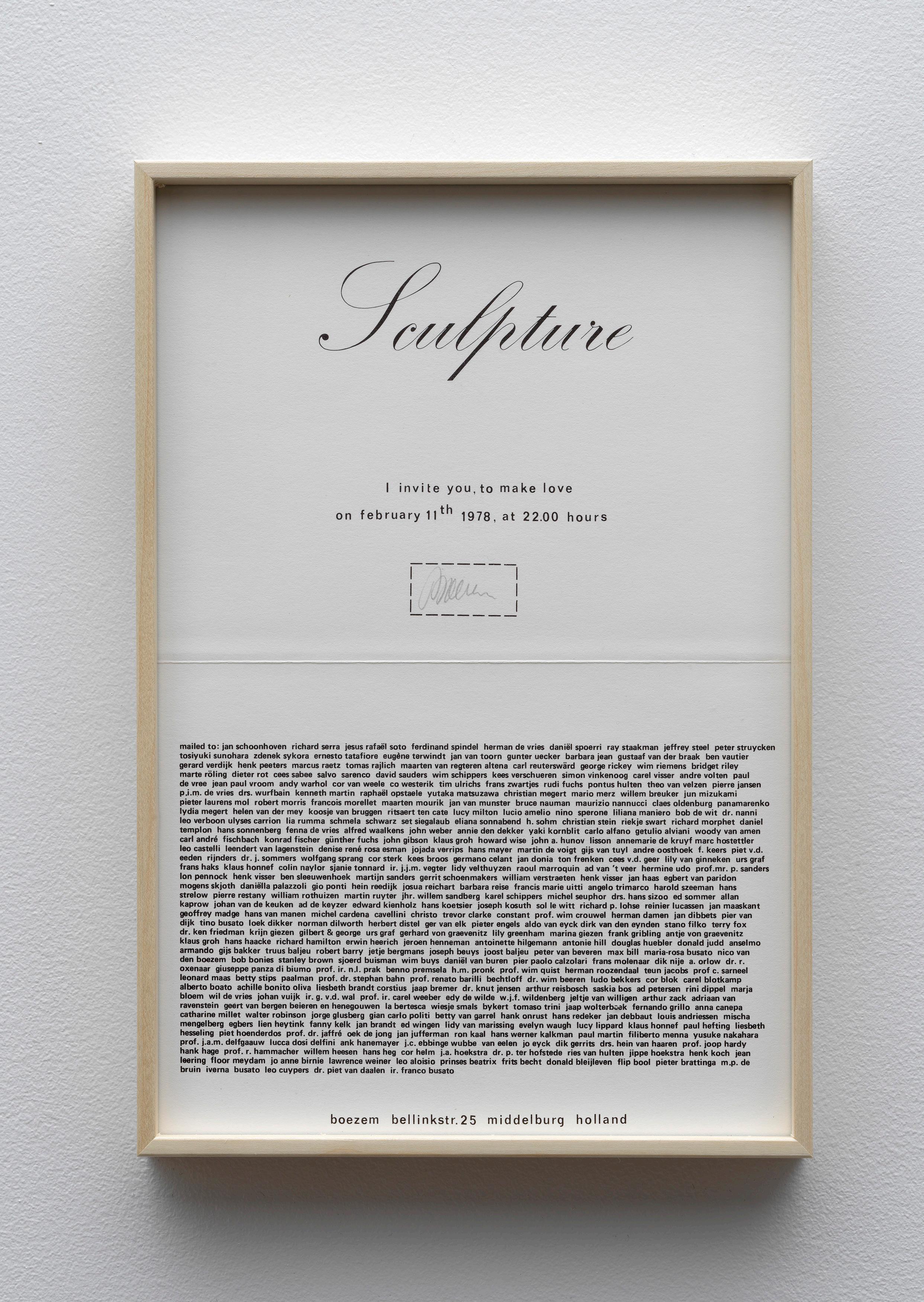 Boezem’s request printed in black ink and signed “to make love on February 11th 1978, at 22:00 hours” was sent to about 350 people at home and abroad, working in the various sectors of the art world. The names of the addressees are listed in a text block on the invitation. The timing of the global action, which is to be understood as a sculpture, was carefully recorded by Boezem and authorised by his signature.