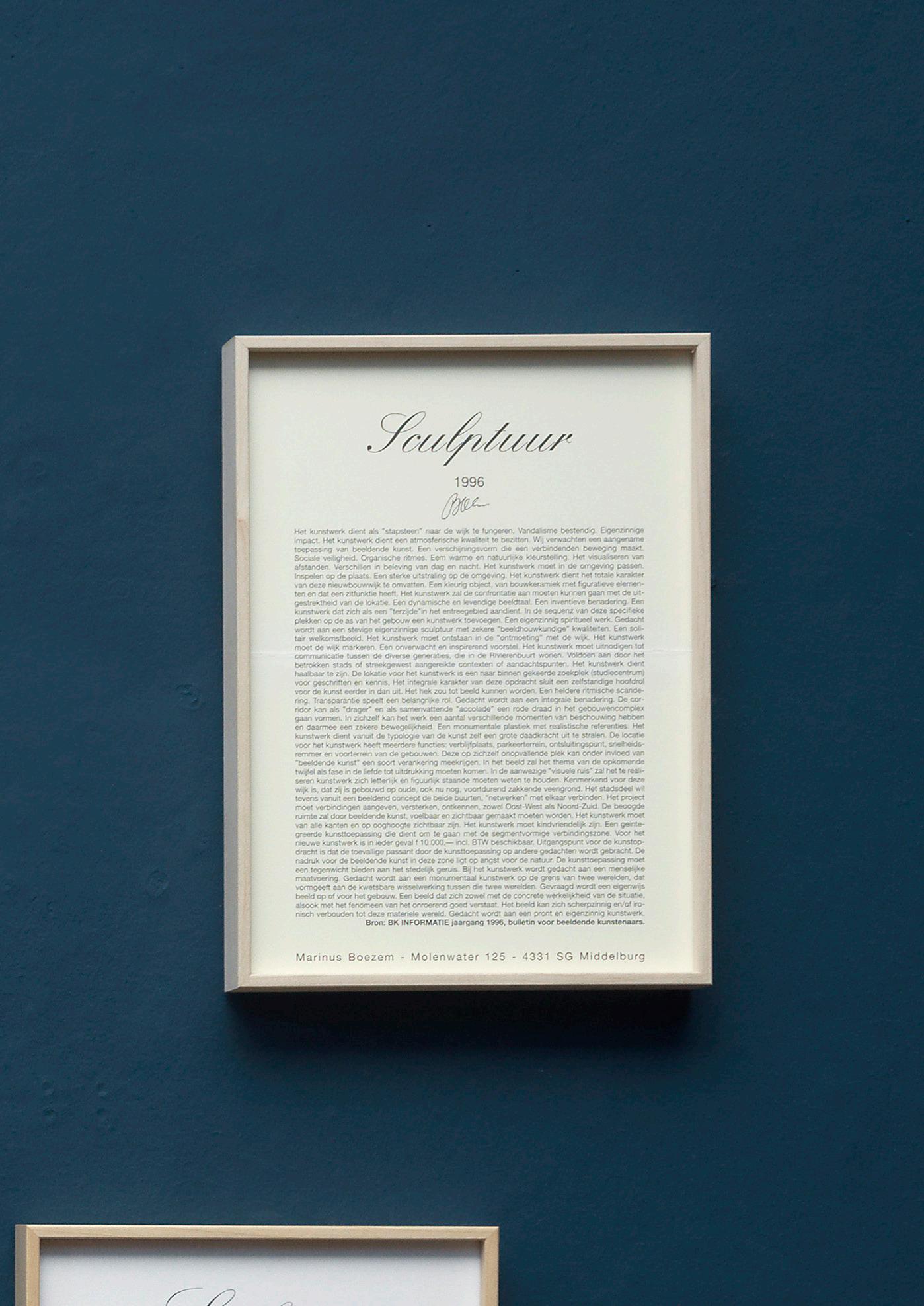 This work consists of a page of text (in Dutch) listing characterizations of artworks in public space, drawn from advertisements in the 1996 volume of BK Informatie, a bulletin in which municipalities and institutions call for submissions for public art commissions. The often cryptic or inflated formulations reveal how certain circles think about art in public space. Boezem finds this way of granting commissions hypocritical and offensive to artists who have committed themselves ideologically to new or alternative concepts of art.