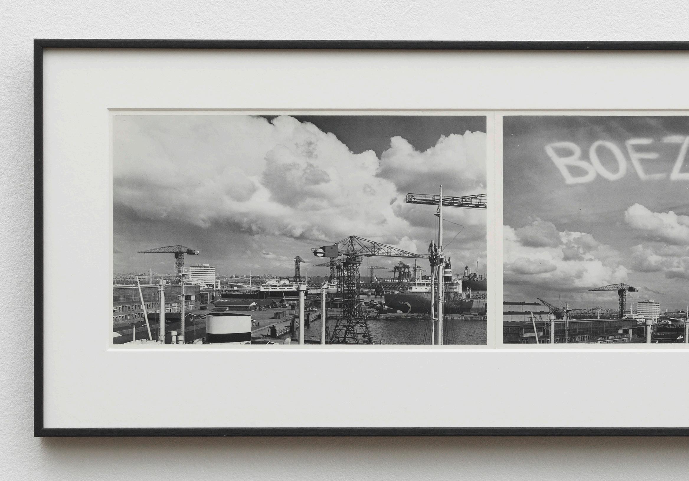In the work Sign the sky above the port of Amsterdam with an aeroplane (1969) a skywriting airplane writes the word ‘Boezem’ with condensation trails in the cloudy sky above Amsterdam’s harbor. After some time the word begins to vanish and ultimately disappears behind a cloud bank. The happening can be conceived as signing the cosmos, but because the signature is sure to disappear, it appears the artist is distancing himself from this pretentious act.